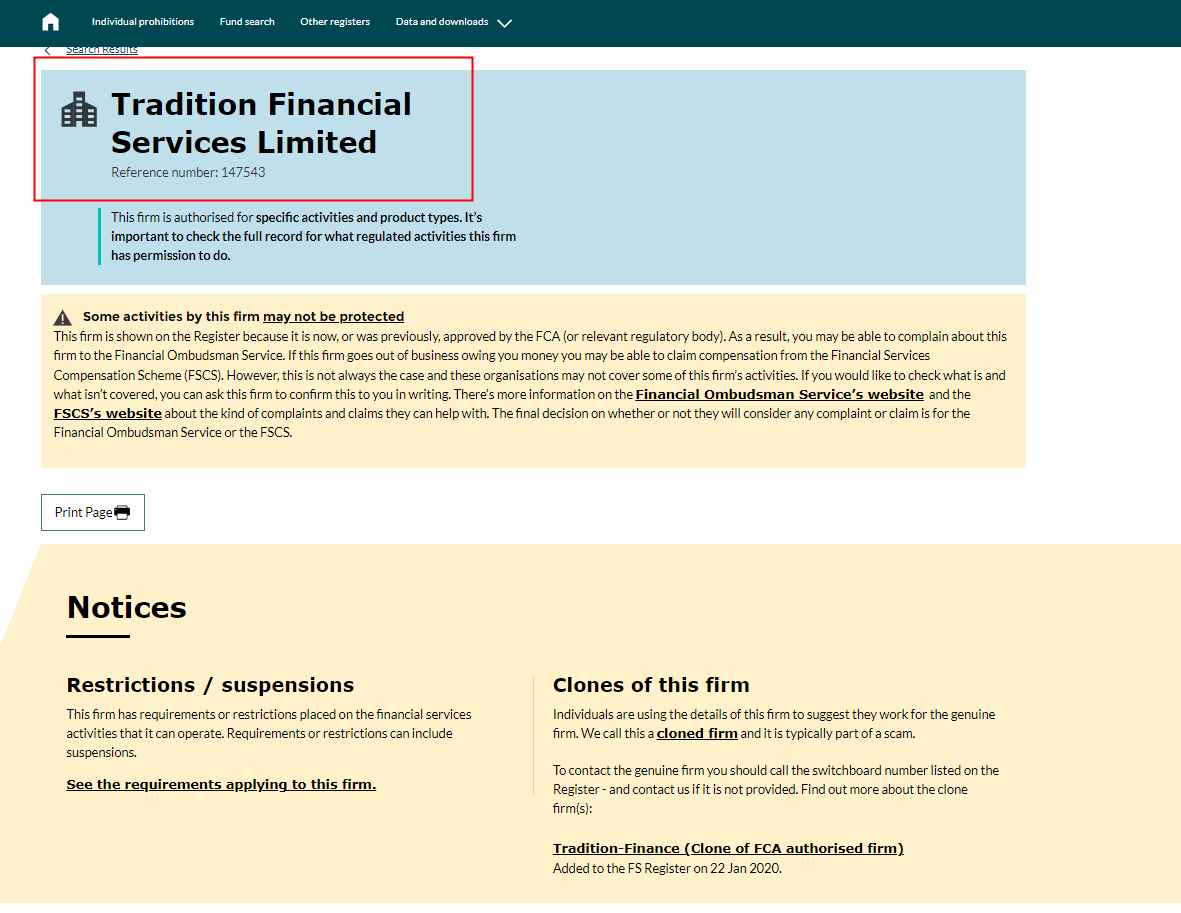 According to its website, ParFX is owned by Tradition Financial Services Limited and is based in the United Kingdom. After verification, we found the corresponding company name on the British company page and the Financial Conduct Authority (FCA), but the registration URL with the FCA does not match the platform URL, and the business scope does not include retail foreign exchange customers.
