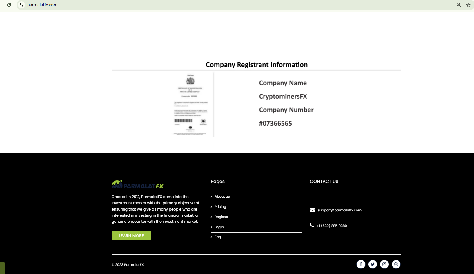 ParmalatFX claims to hold a certificate from the Companies House (CH), registered under the number 07366565 and the company name CryptominersFX. However, this registration number in the CH register is associated with a dissolved company, Edata Matters Limited. This inconsistency raises a red flag for potential fraudulent activities.
