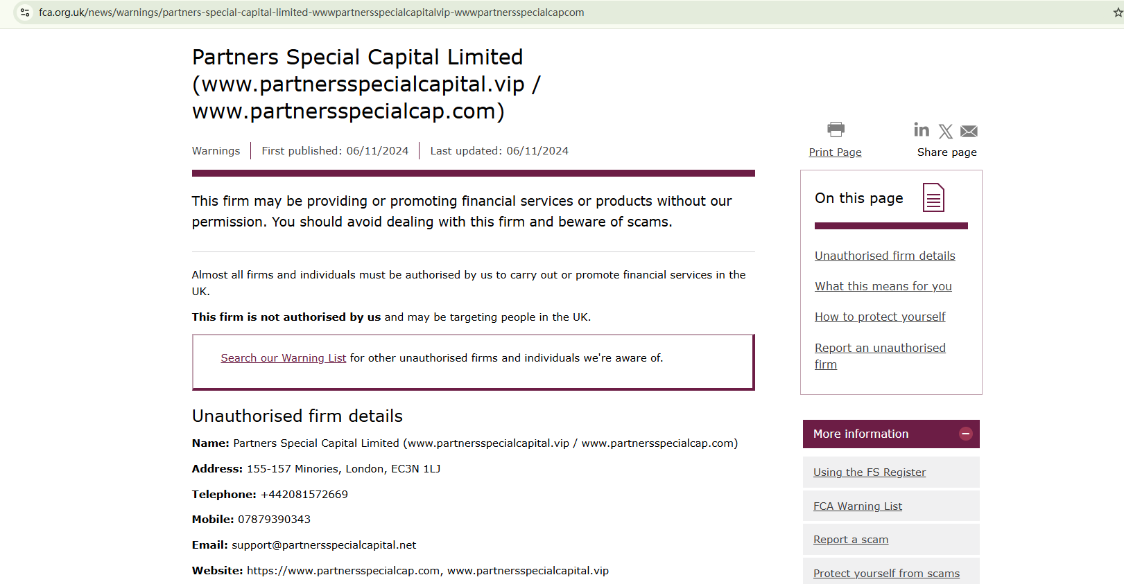 On November 6, 2024, the Financial Conduct Authority (FCA) issued a warning against Partners Special Capital Limited, believing this company might be providing financial services or products without proper authorization in the UK. https://www.fca.org.uk/news/warnings/partners-special-capital-limited-wwwpartnersspecialcapitalvip-wwwpartnersspecialcapcom