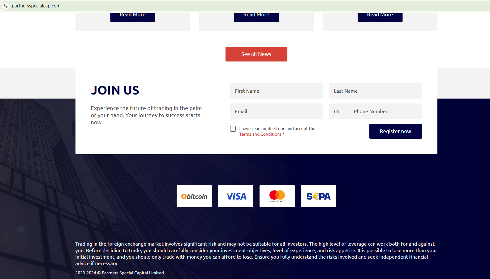 Partners Special Capital Limited has two domains, with one now disabled. The remaining domain was registered at the end of August 2024, making the website quite new. The broker vaguely claims to be regulated but fails to provide any valid licenses to support this claim. These facts suggest that Partners Special Capital Limited is unlicensed and likely a scam. The Financial Conduct Authority (FCA) has already included Partners Special Capital Limited on its warning list.
