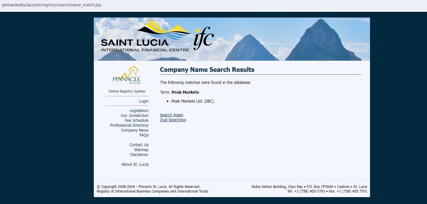 Upon investigation, we found that Peak Markets Ltd is registered with the International Financial Centre (IFC) in Saint Lucia, an International Business Companies Registry that doesn't license forex trading brokerage activities. The financial watchdog of St. Lucia, Financial Services Regulatory Authority (FSRA) has stated that forex trading activities are not licensed there. Without any other valid financial licenses, Peak Markets's financial services for forex trading are not legitimate.