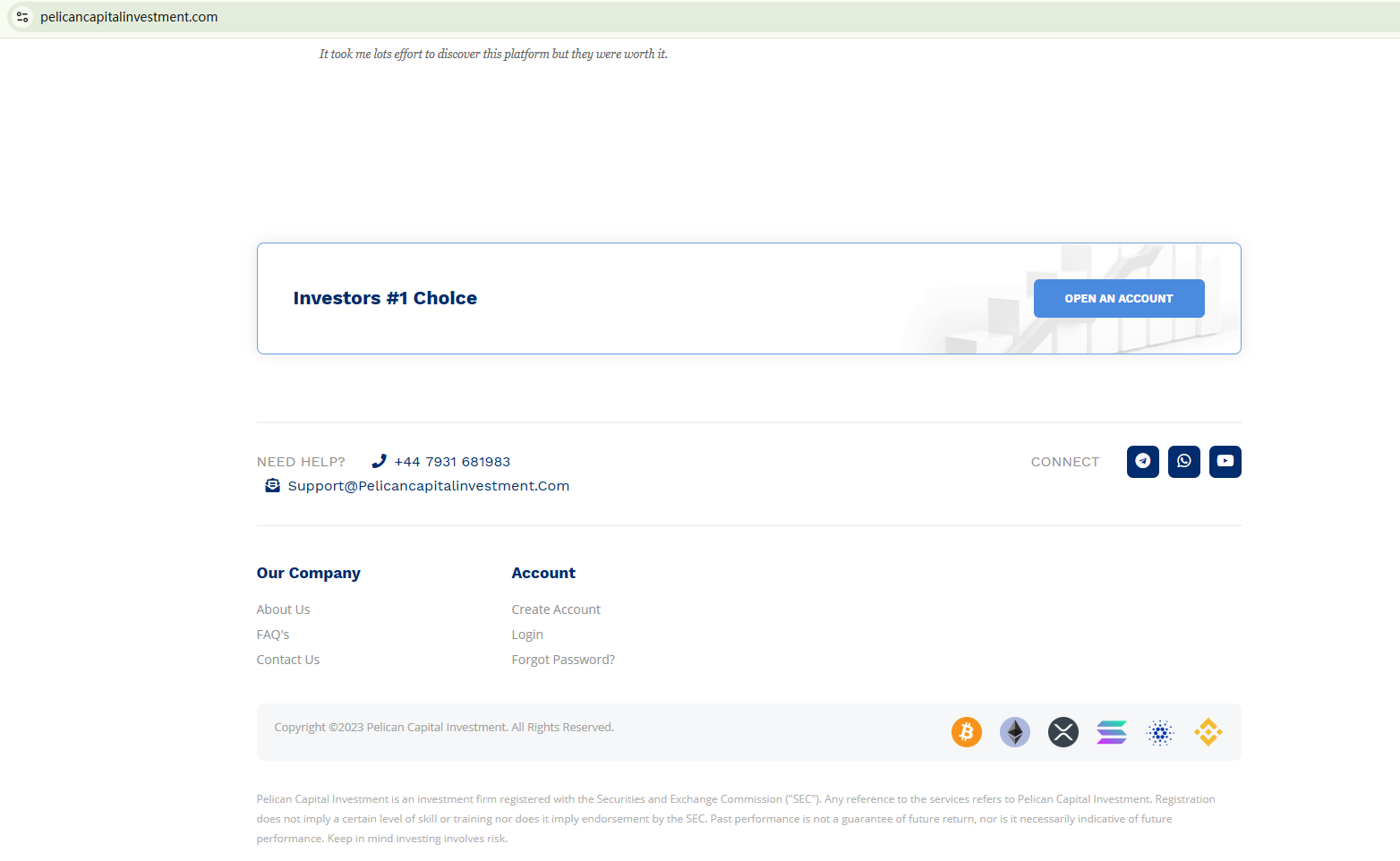 Pelican Capital Investment asserts that it is domiciled in the UK and authorized by the Securities and Exchange Commission (SEC). However, the firm fails to specify which SEC it is referring to. More importantly, the UK does not have a regulatory authority named the SEC—the responsibility for overseeing financial firms in the UK lies with the Financial Conduct Authority (FCA).