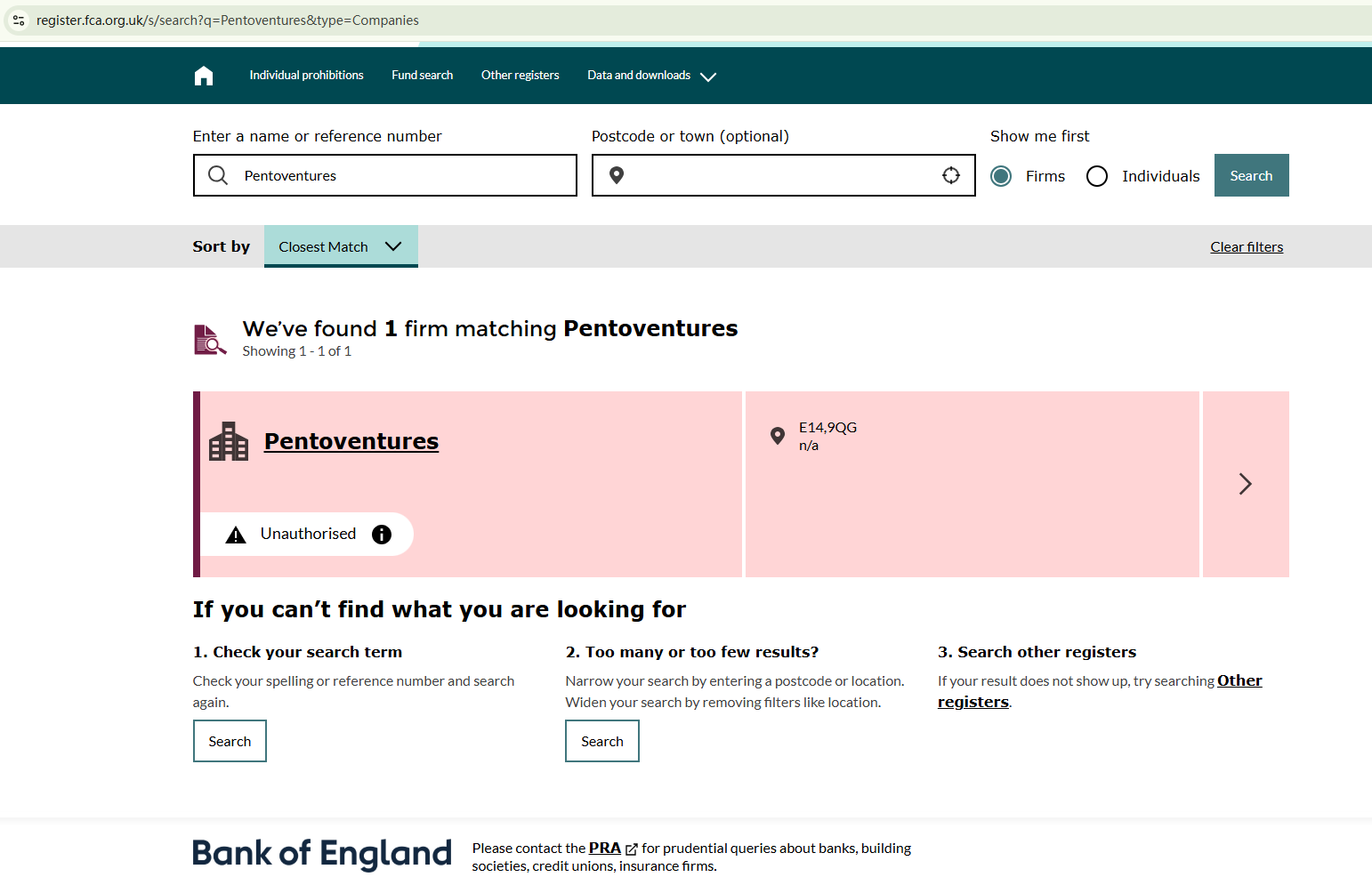 A check on Pentoventures' website reveals that no regulatory information is displayed. While the site states their address is in the UK, a search with the UK Financial Conduct Authority (FCA) shows that the company is not authorized. This strongly indicates that it may be a scam.