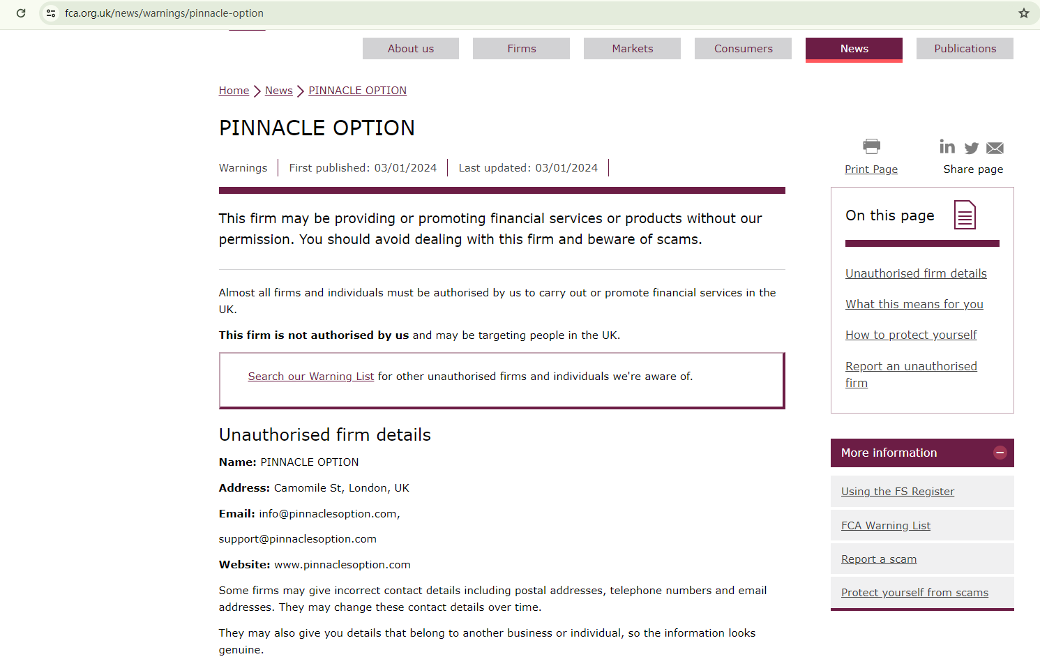 On January 3, 2024, the Financial Conduct Authority (FCA) issued a warning against PINNACLE OPTION, believing this company might be providing financial services or products without proper authorization in the UK. https://www.fca.org.uk/news/warnings/pinnacle-option