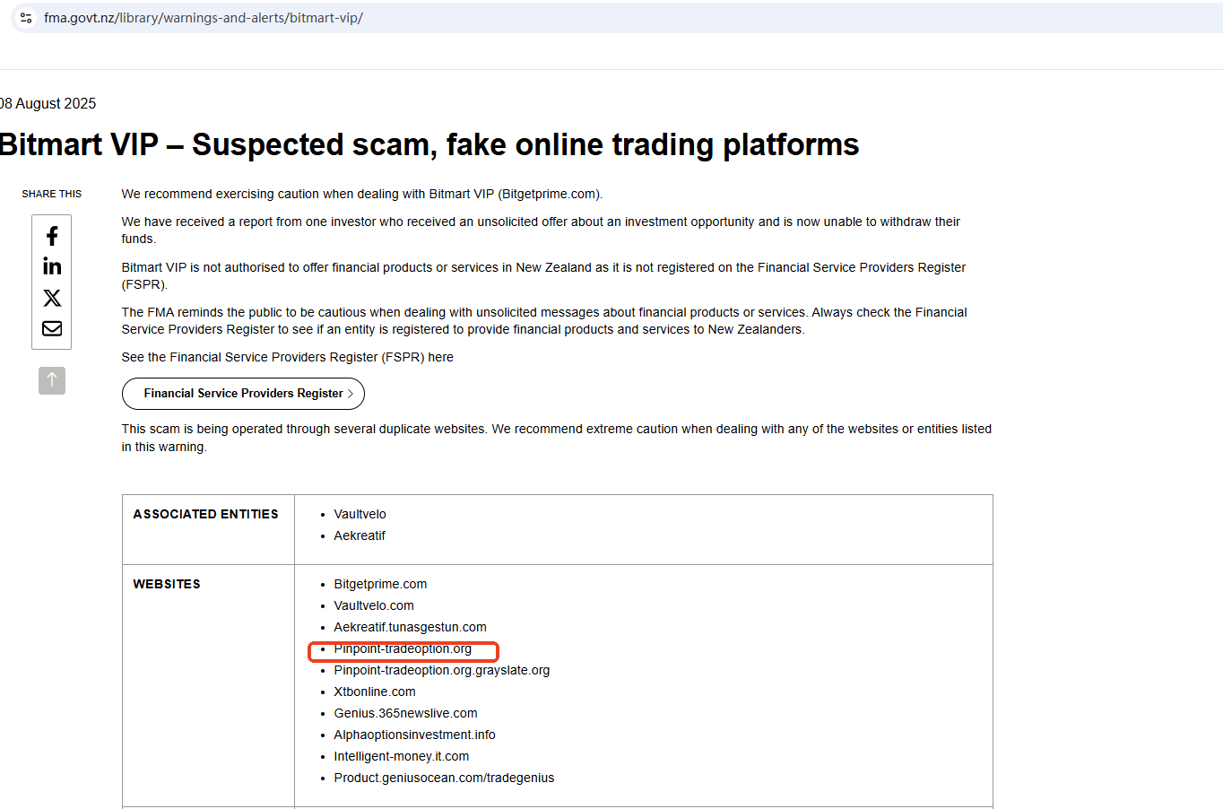 On Aug 8, 2025, the New Zealand Financial Markets Authority (NZ FMA) added Pinpoint Trade its warning list, stating that this is a fake investment platform. https://www.fma.govt.nz/library/warnings-and-alerts/bitmart-vip/