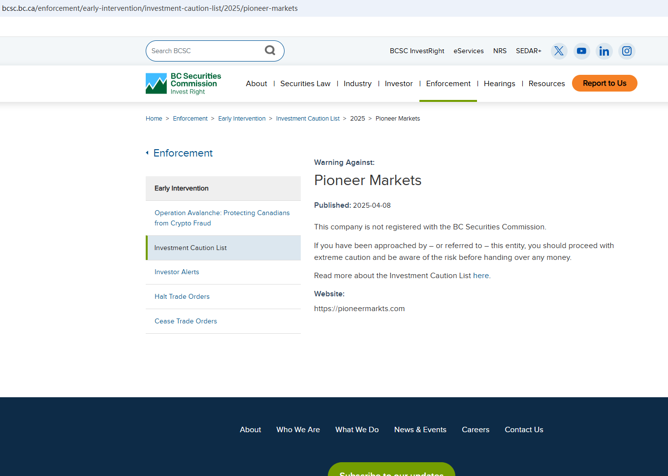 On April 8, 2025, the British Columbia Securities Commission (BCSC) issued a warning that Pioneer Markets was providing financial services or products without authorisation. You may visit: https://www.bcsc.bc.ca/enforcement/early-intervention/investment-caution-list/2025/pioneer-markets