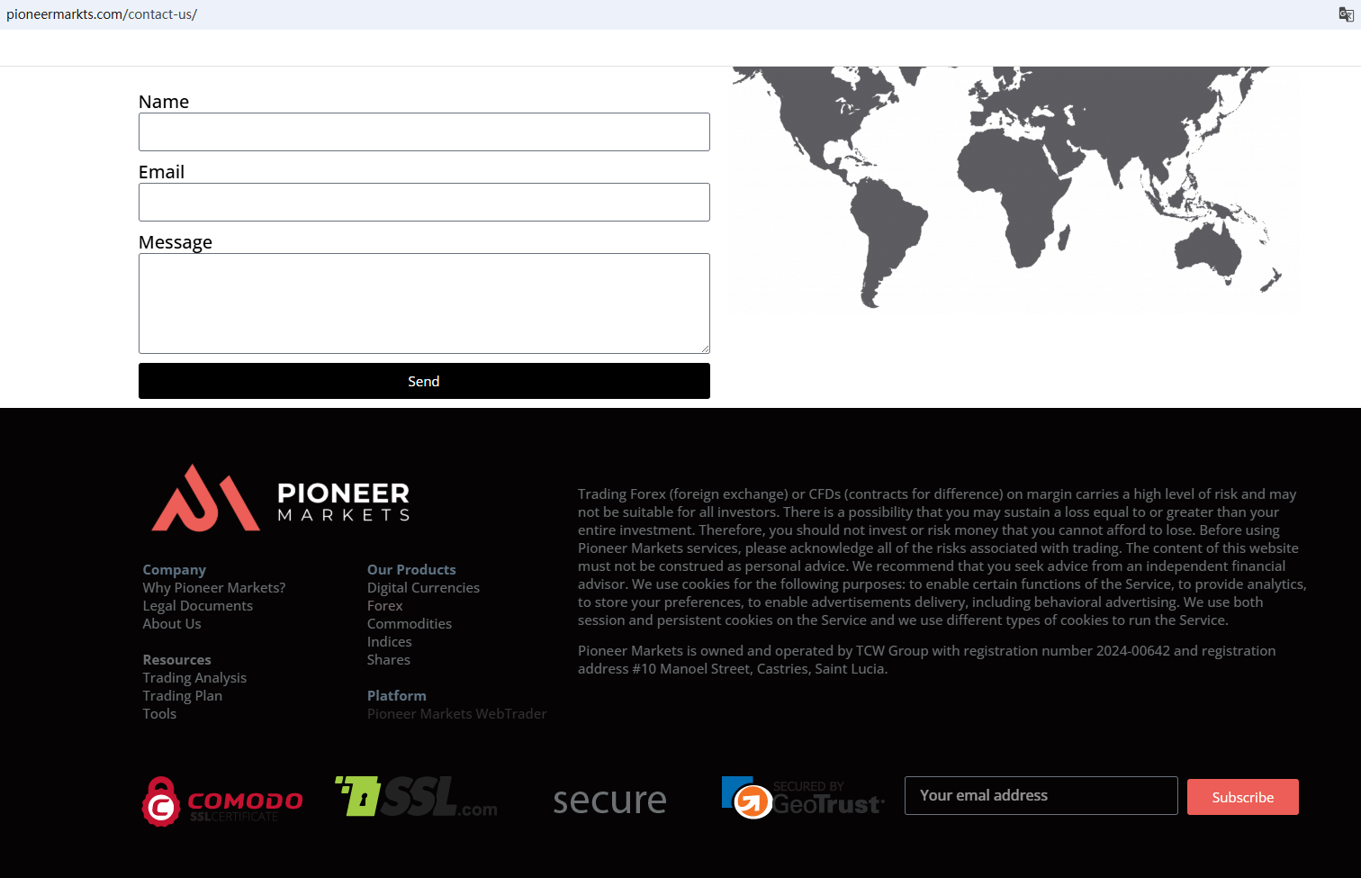 It claims on its website that it is affiliated with TCW Group and is registered in St. Lucia. As we all know, St. Lucia does not have the right to regulate foreign exchange. More importantly, the British Columbia Securities Commission (BCSC) issued a warning that Pioneer Markets was providing financial services or products without authorisation.