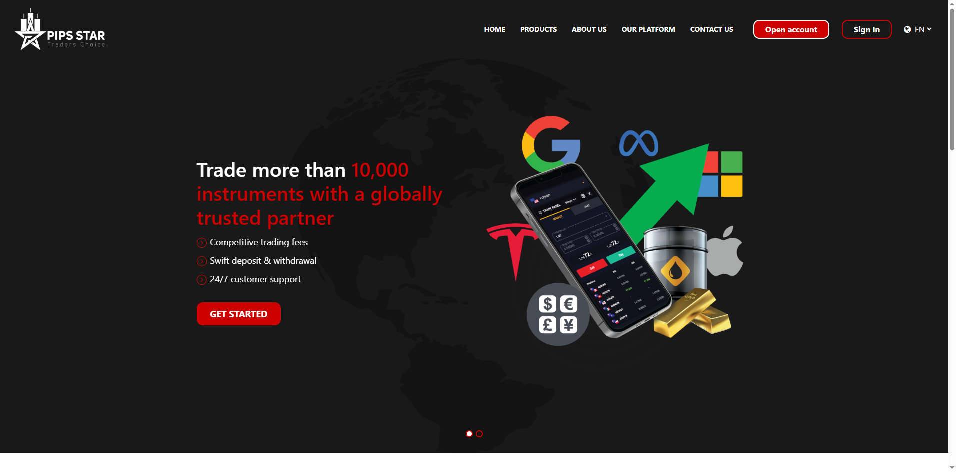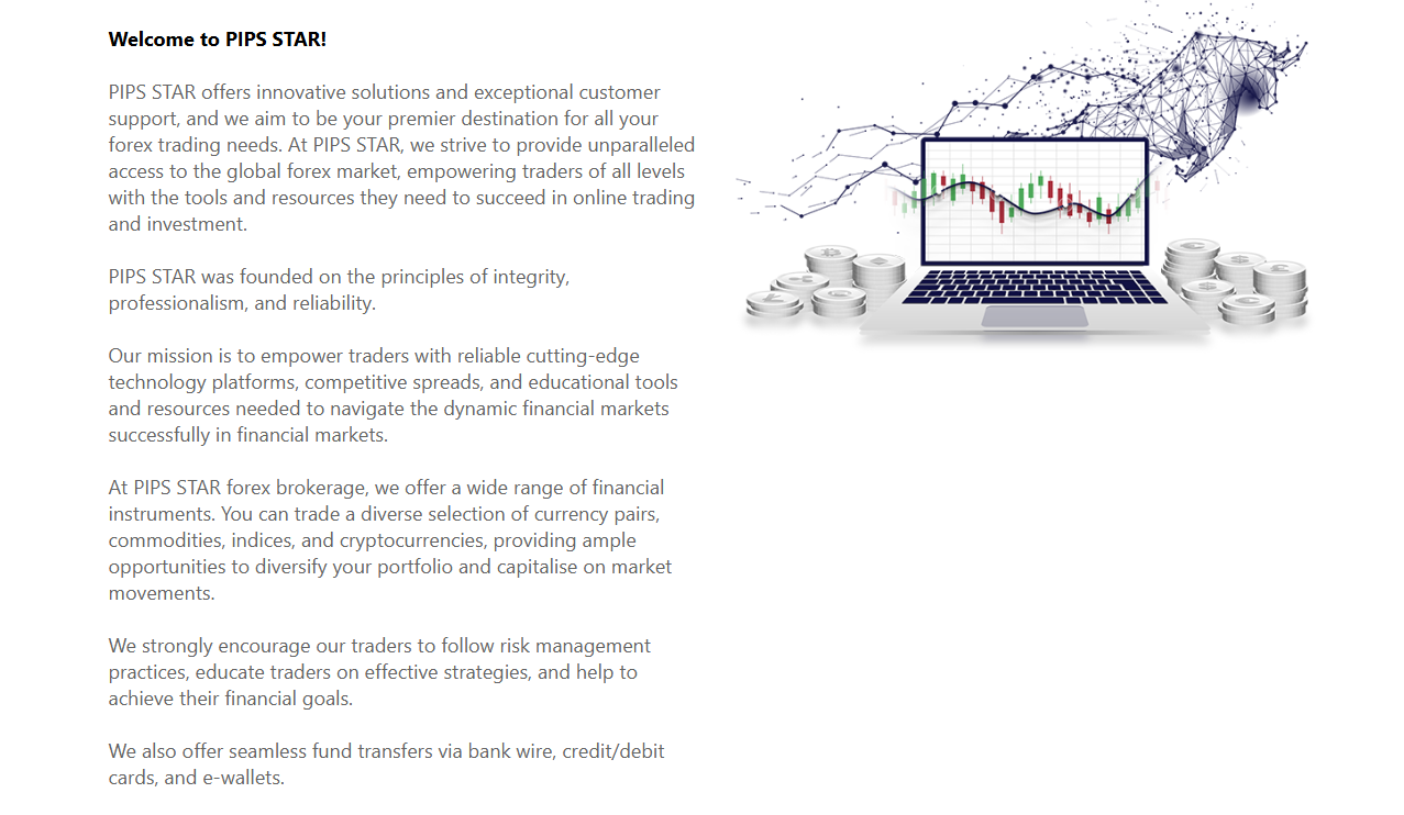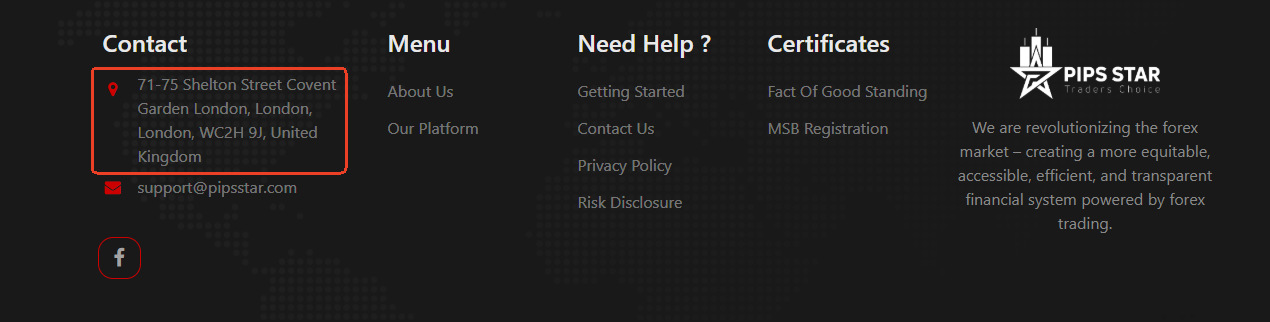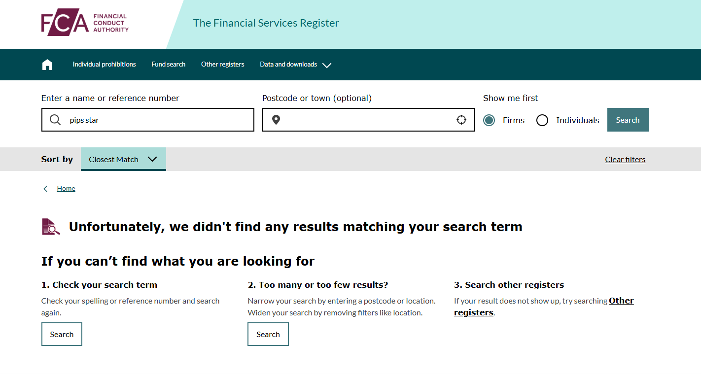 Pips Star's website fails to disclose a verifiable legal entity name or any legitimate regulatory information, only a UK business address is provided. We conducted a thorough search of the UK Financial Conduct Authority (FCA) register using all available details, including the listed address, but found no record of Pips Star or any affiliated company.