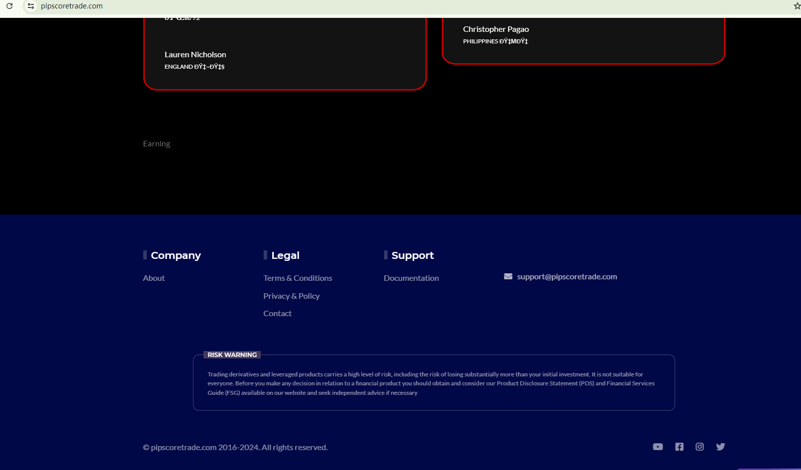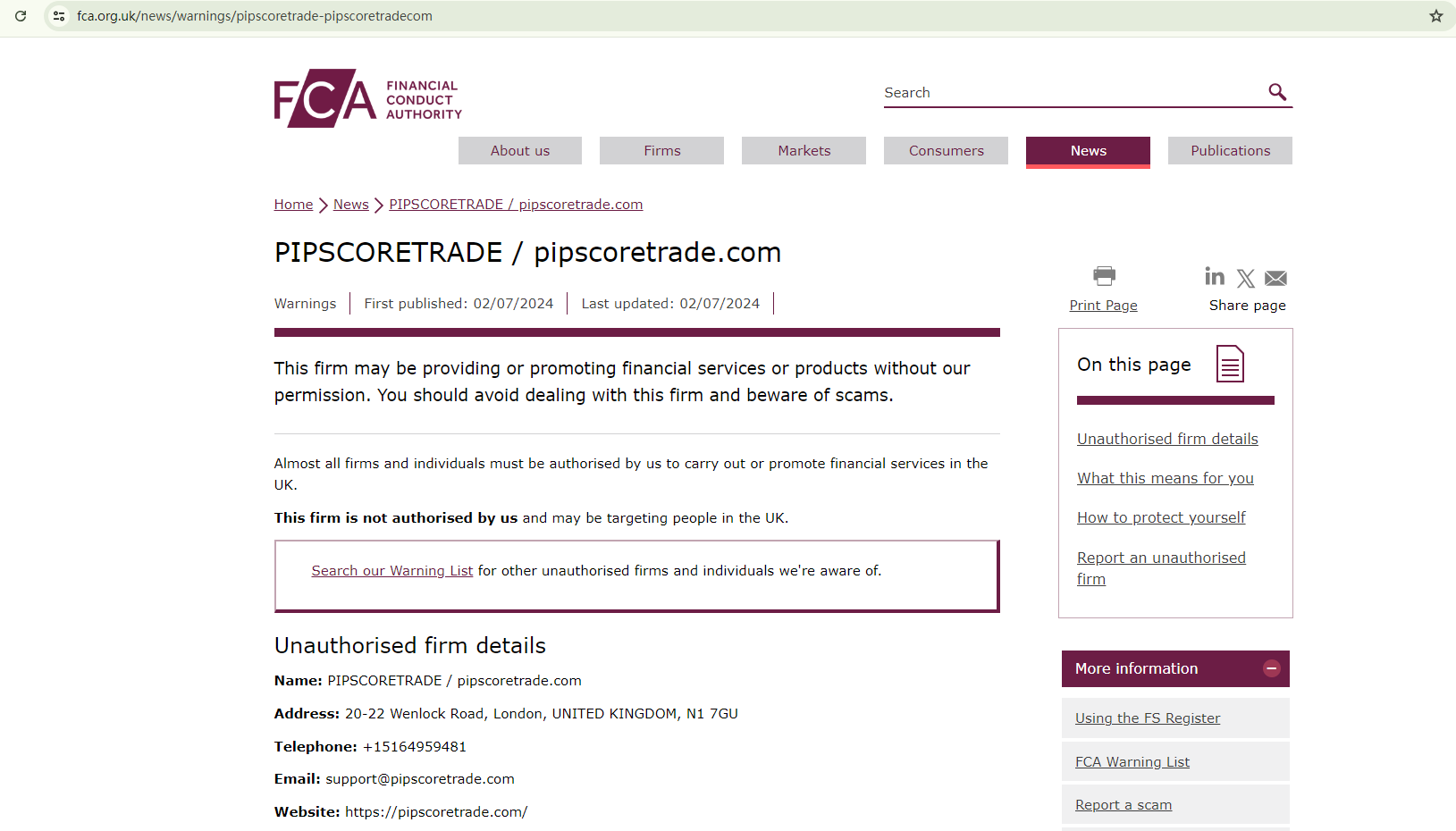 PIPSCORETRADE fails to provide any regulatory information to demonstrate its legitimacy. This is a warning sign. In addition, the Financial Conduct Authority (FCA) of the UK has issued a warning against PIPSCORETRADE, identifying it as an unregulated firm in the country.