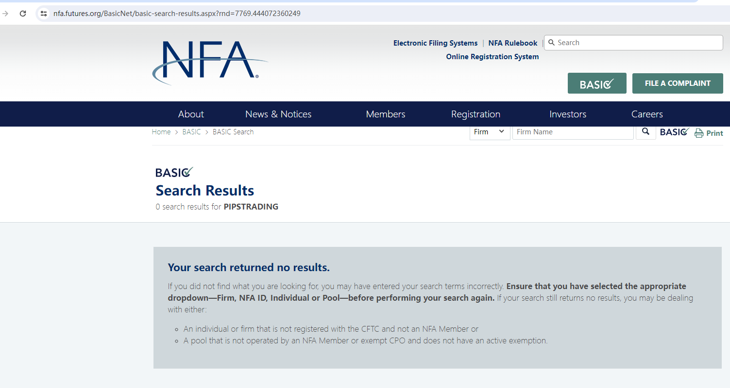 There is no any regulatory information on its website. This broker locates in the United States, to operate as this type of broker in the United States, a company must be registered with the Commodity Futures Trading Commission (CFTC) and to be a member of the National Futures Association (NFA), pipstrading is not listed among the members of the NFA.