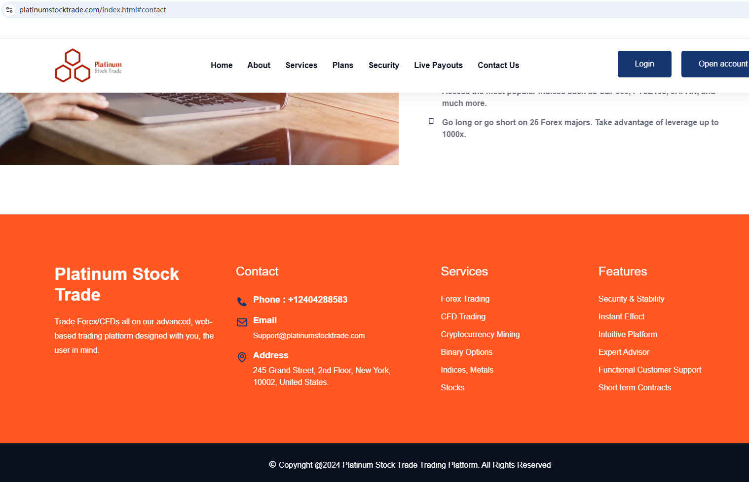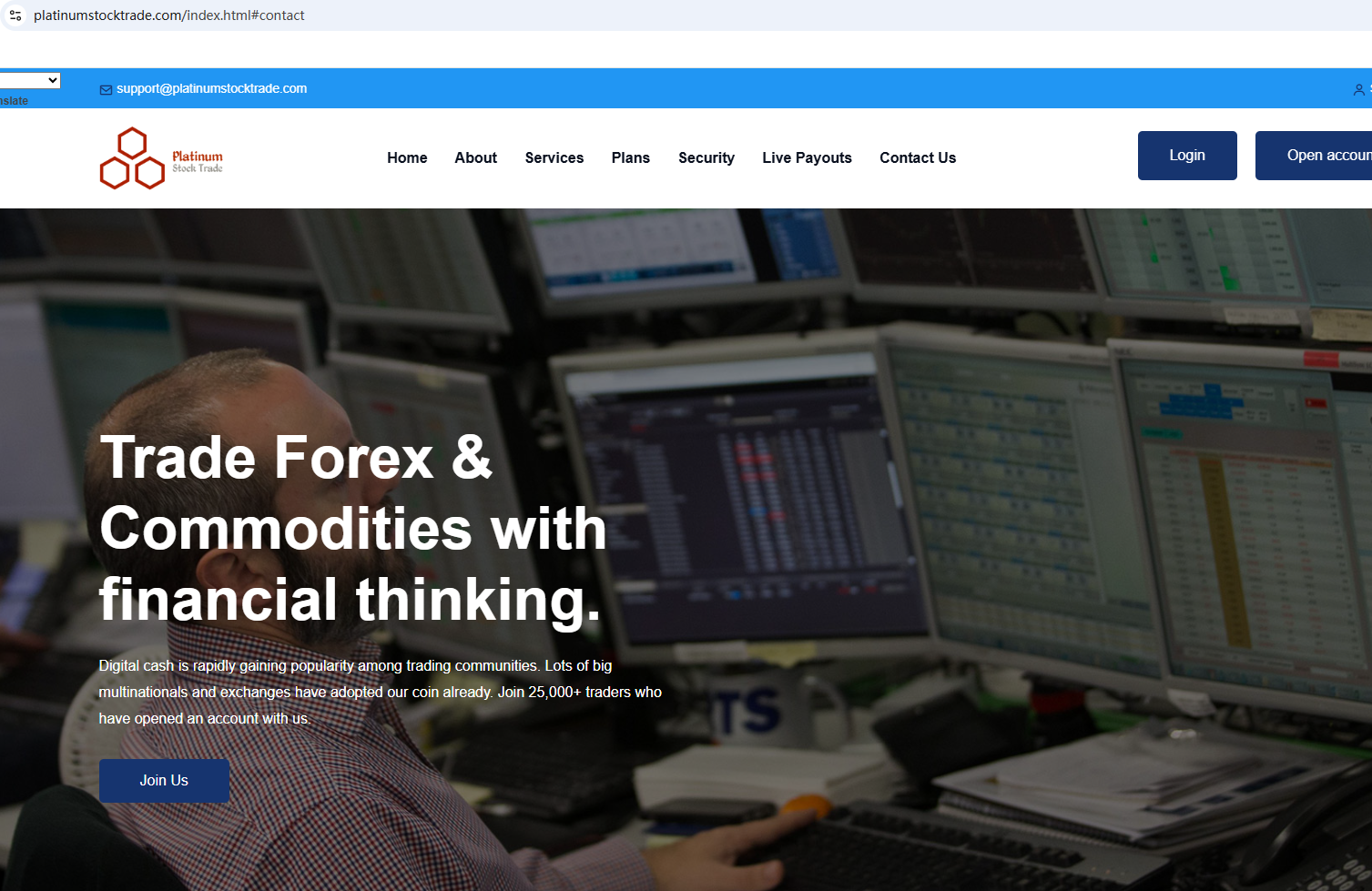 According to its website, it is located in the US. Upon investigation, no matching information was found in the National Futures Association (NFA). In addition, the National Securities Market Commission (CNMV) issued a warning against Platinum Stock Trade, believing this company might be providing financial services or products without proper authorization.