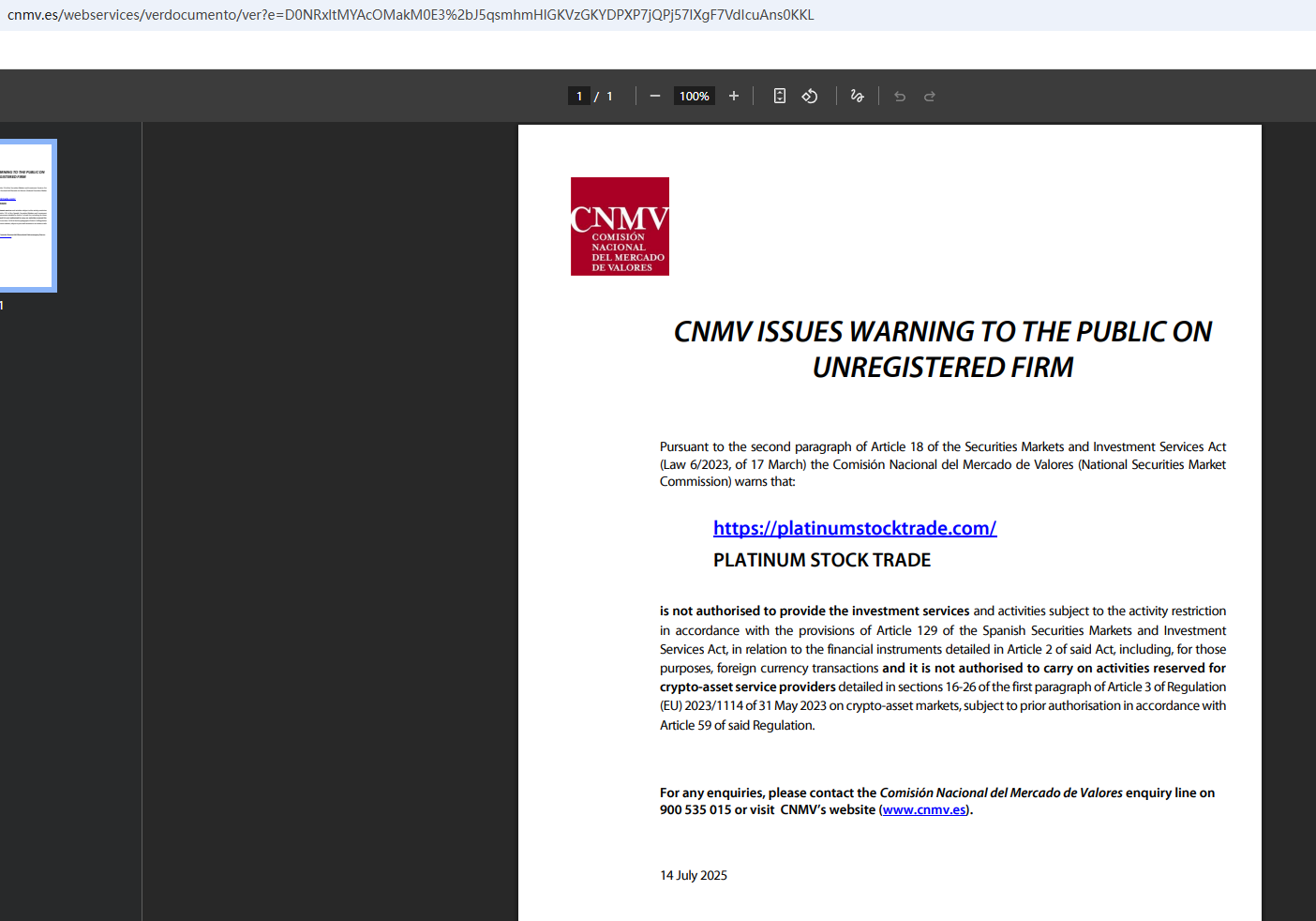On July 14, 2025, the National Securities Market Commission (CNMV) issued a warning against Platinum Stock Trade, believing this company might be providing financial services or products without proper authorization. https://www.cnmv.es/webservices/verdocumento/ver?e=D0NRxltMYAcOMakM0E3%2bJ5qsmhmHlGKVzGKYDPXP7jQPj57IXgF7VdIcuAns0KKL