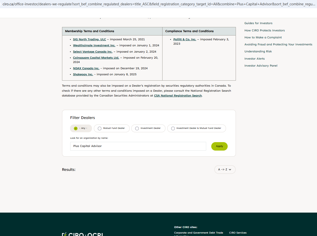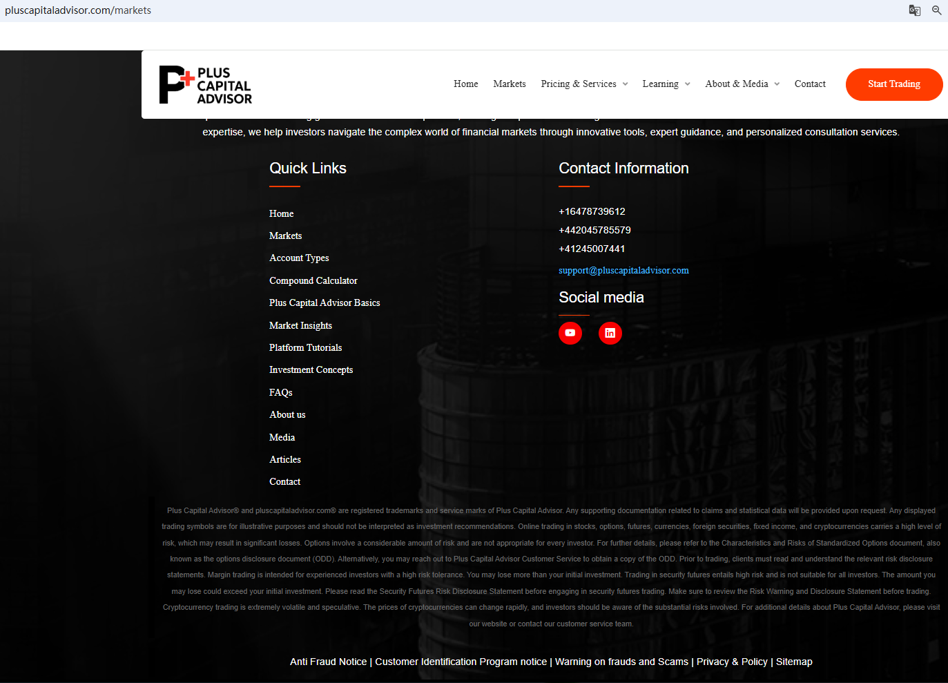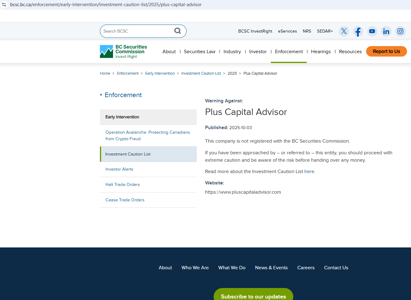 On Oct 3, 2025, the British Columbia Securities Commission (BCSC) issued a warning against Plus Capital Advisor, stating that this broker is not registered to trade in, or advise on, securities or derivatives in BC. https://www.bcsc.bc.ca/enforcement/early-intervention/investment-caution-list/2025/plus-capital-advisor