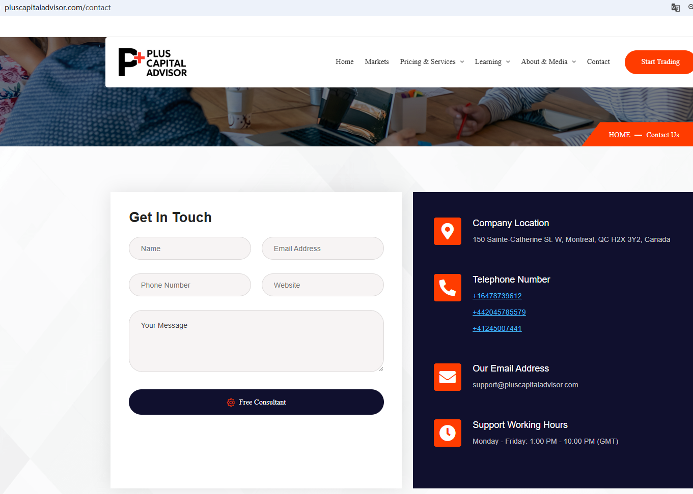 According to its website, the company claims to be a reliable entity with an address in Canada. However, no matching information was found in the Investment Industry Regulatory Organization of Canada (IIROC). In addition, the British Columbia Securities Commission (BCSC) issued a warning against Plus Capital Advisor, stating that this broker is not registered to trade in, or advise on, securities or derivatives in BC.