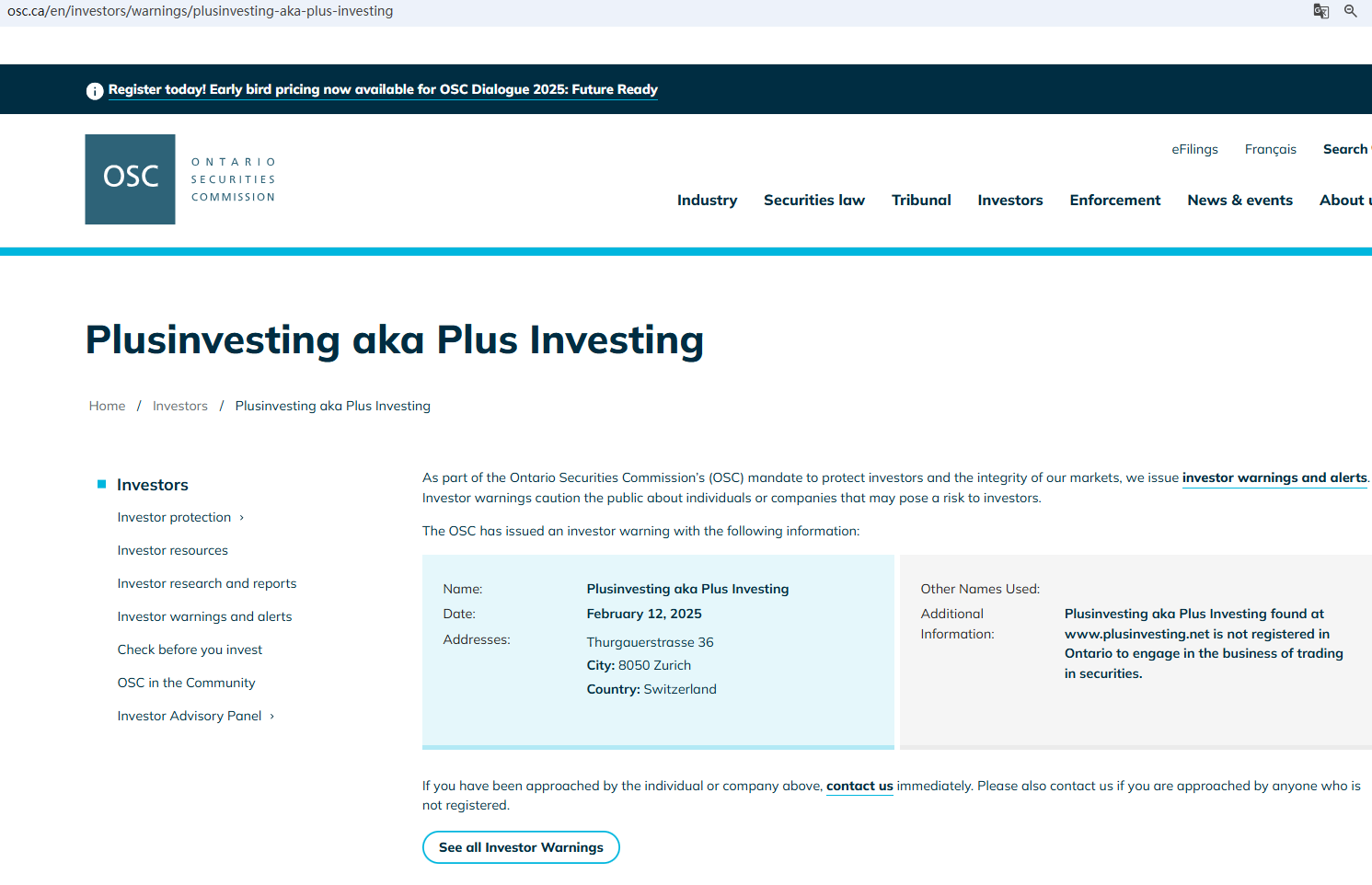 In addition, the Ontario Securities Commission (OSC) issued a warning against Plusinvesting aka Plus Investing, believing this company might be providing financial services or products without proper authorization.