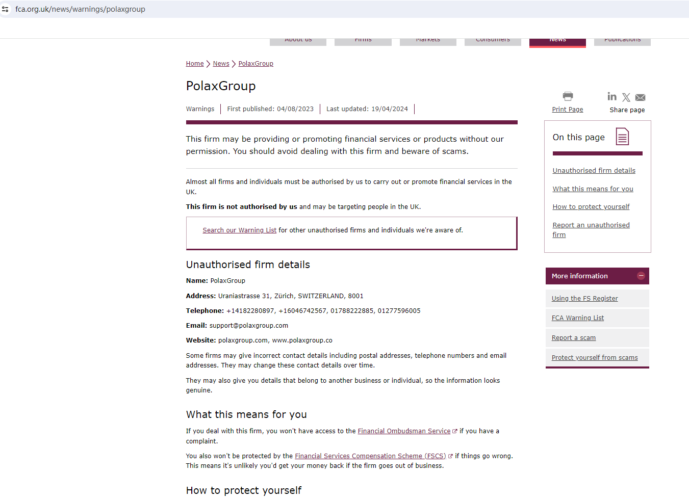 Additionally, the Financial Conduct Authority (FCA) has issued a warning against PolaxGroup, cautioning the public of this unauthorized firm.