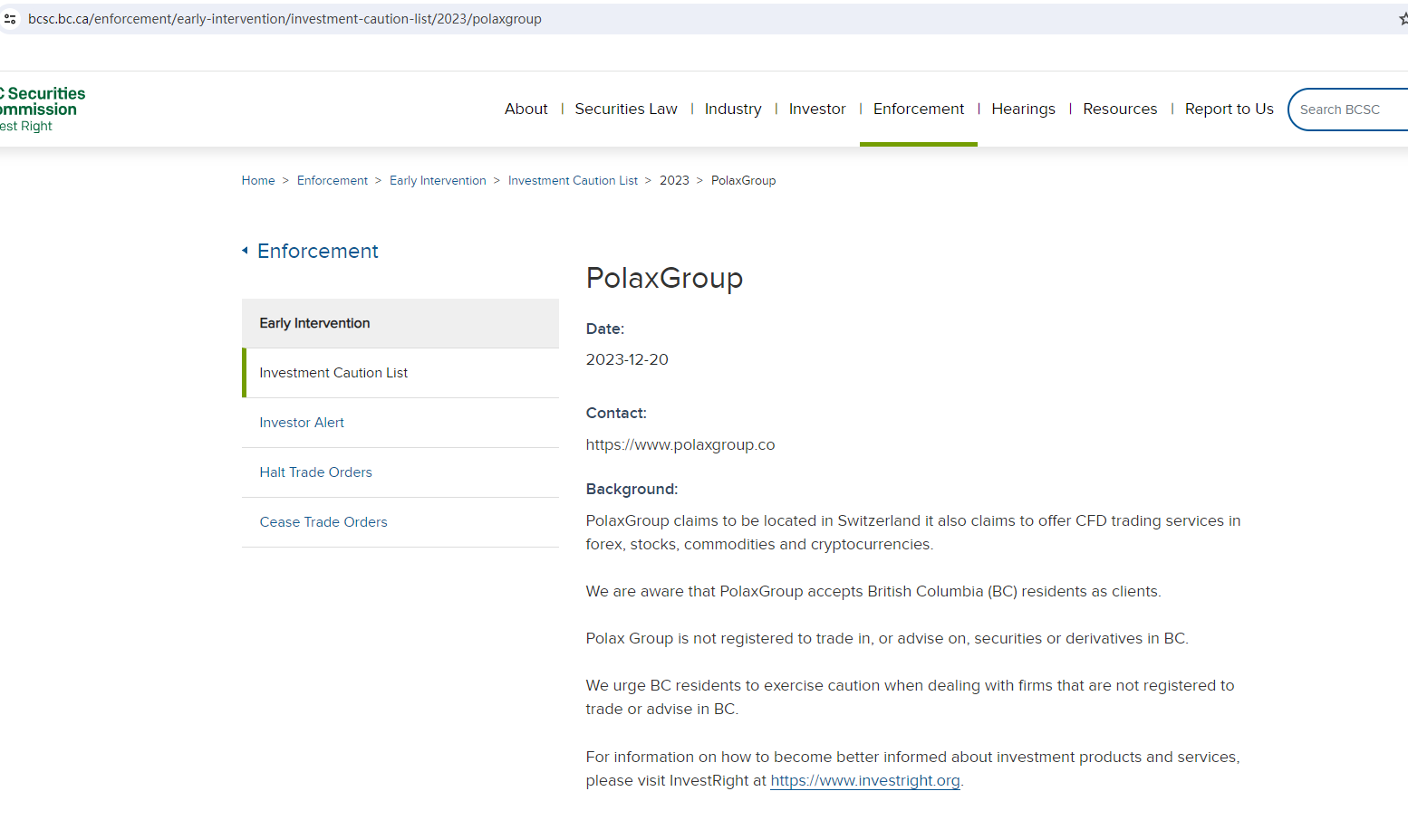 On 20 December 2023, the British Columbia Securities Commission (BCSC) issued a warning against PolaxGroup, stating that this broker is not registered to trade in, or advise on, securities or derivatives in BC. https://www.bcsc.bc.ca/enforcement/early-intervention/investment-caution-list/2023/polaxgroup