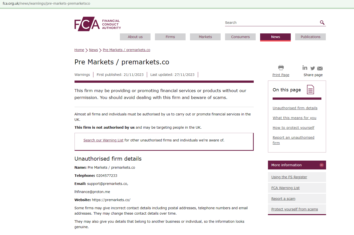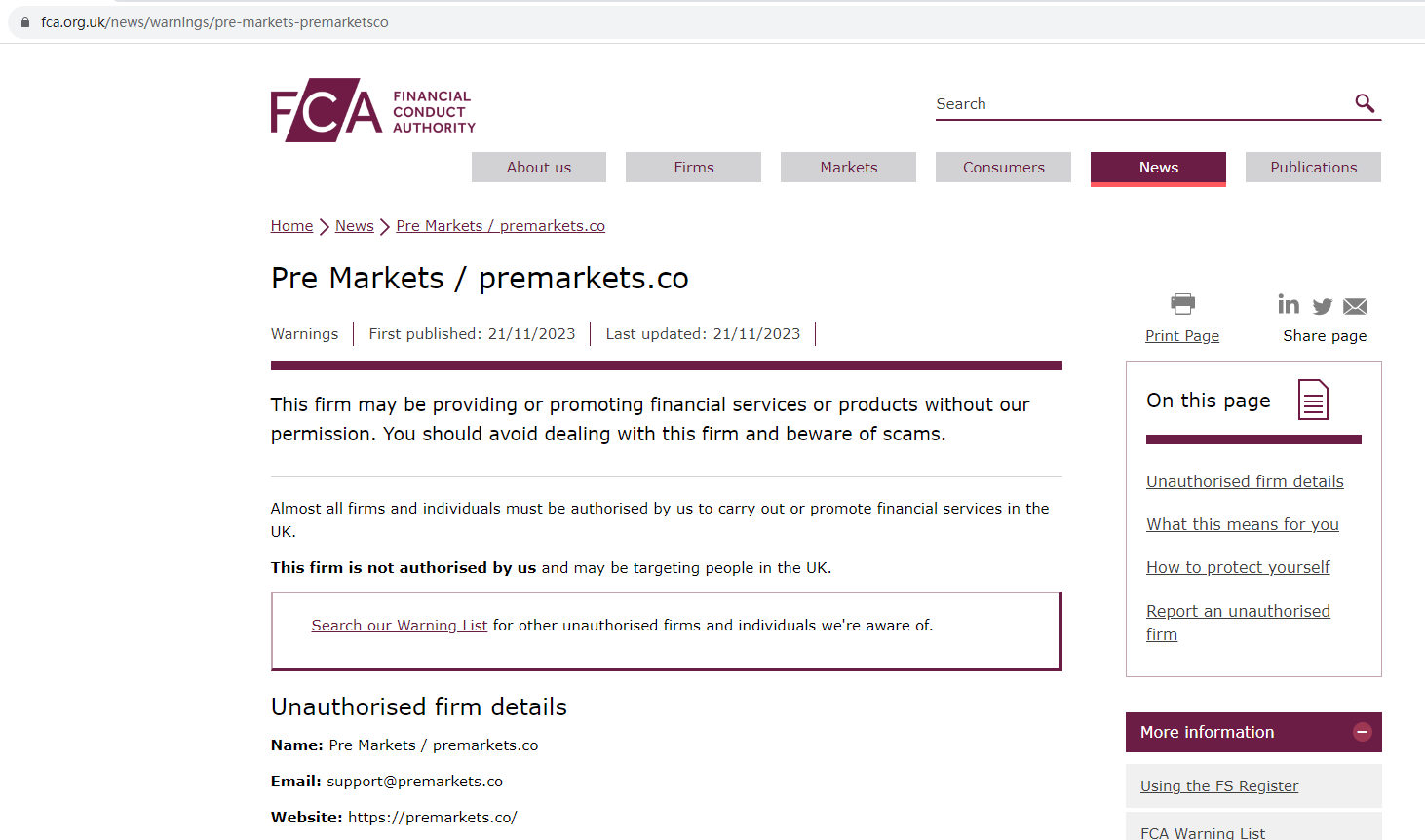 On 21 November 2023, the United Kingdom Financial Conduct Authority (UK FCA) issued a warning that Pre Markets was providing financial services or products in the UK without authorisation. You may visit: https://www.fca.org.uk/news/warnings/pre-markets-premarketsco