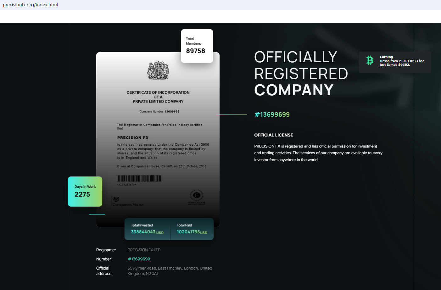 According to its website, it owns a reputable company, but provides no strong regulatory credentials on the site. Although it displays a Company House (CH) certificate, it's clear that CH lacks the authority to regulate foreign exchange. Furthermore, the National Securities Market Commission (CNMV) issued a warning against PRECISION FX, as it believed this company might be providing financial services or products without proper authorization.