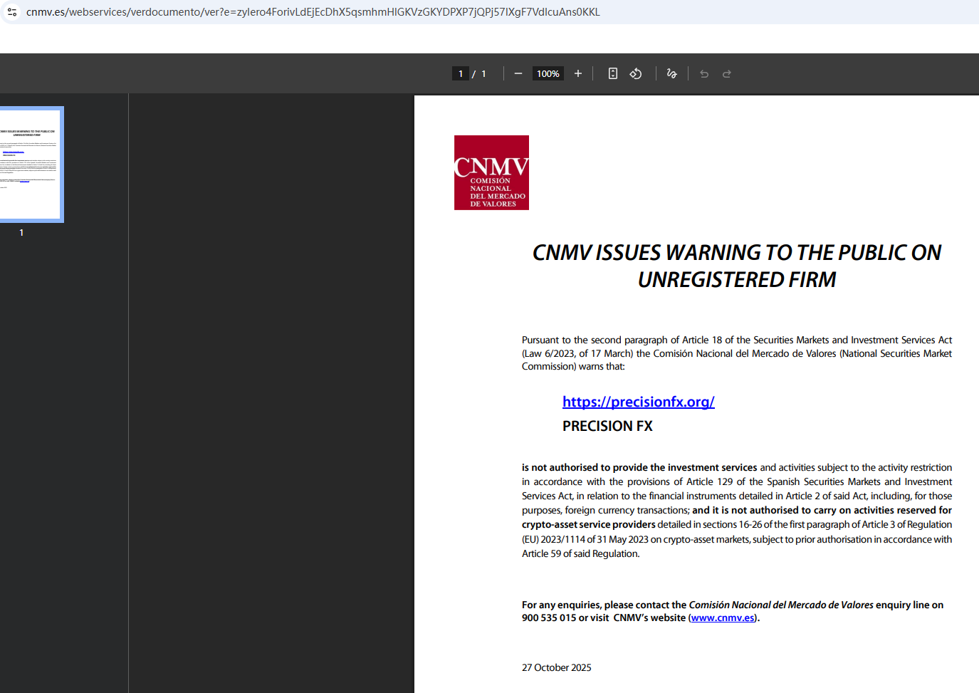 On Oct 27, 2025, the National Securities Market Commission (CNMV) issued a warning against PRECISION FX, believing this company might be providing financial services or products without proper authorization. https://www.cnmv.es/webservices/verdocumento/ver?e=zyIero4ForivLdEjEcDhX5qsmhmHlGKVzGKYDPXP7jQPj57IXgF7VdIcuAns0KKL