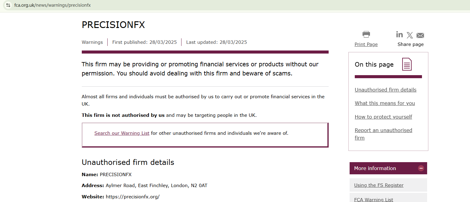 On March 28, 2025, the Financial Conduct Authority (FCA) issued a warning against PRECISIONFX for the lack of the required authorization. https://www.fca.org.uk/news/warnings/precisionfx