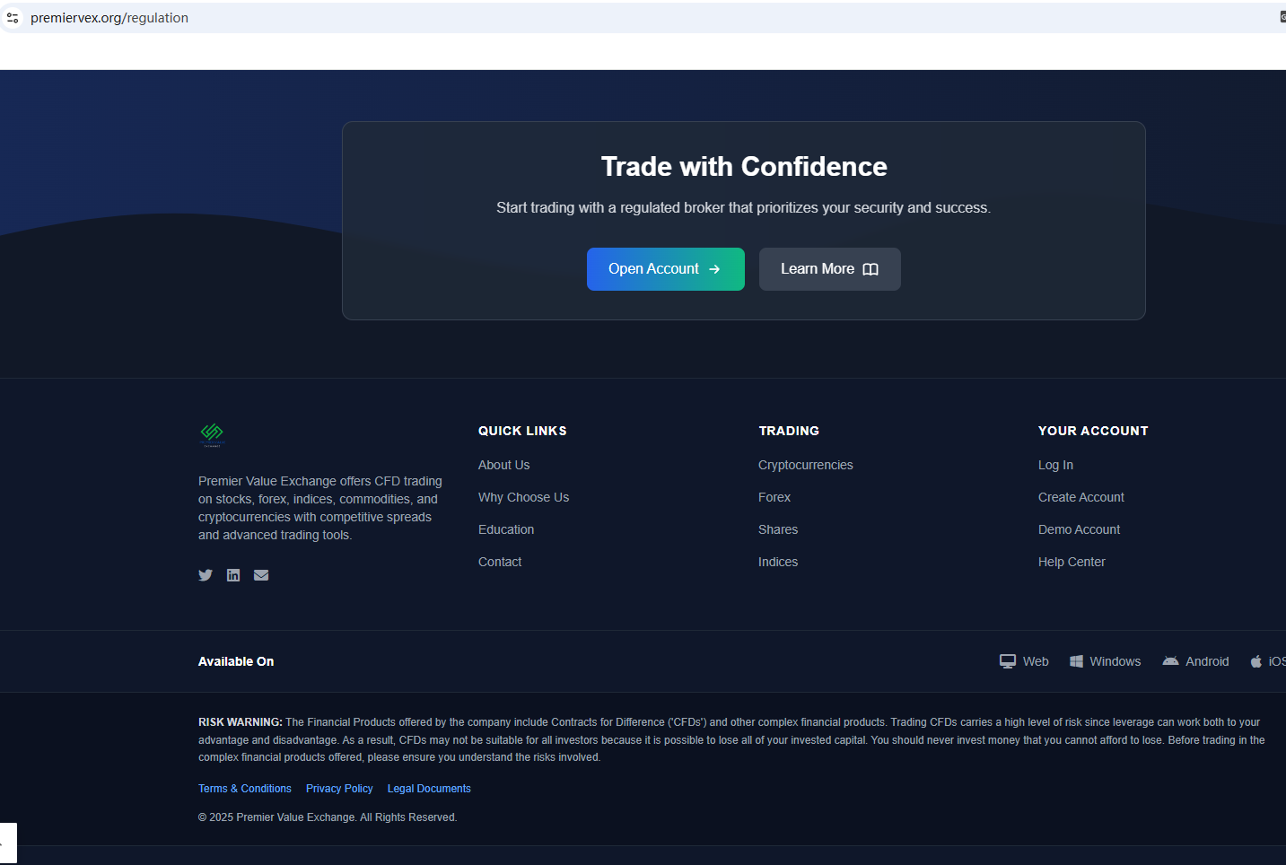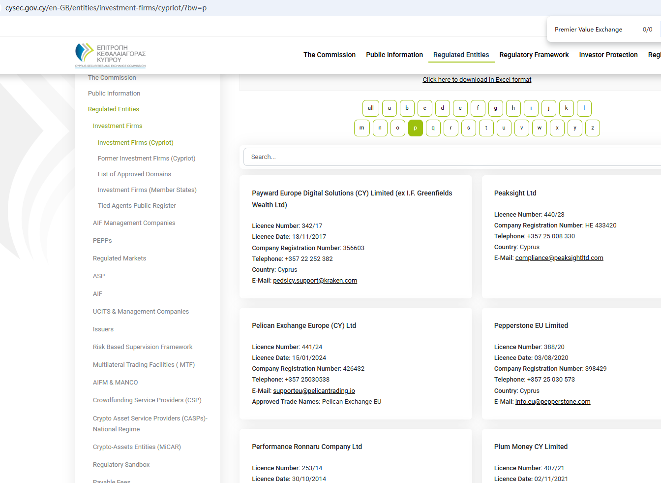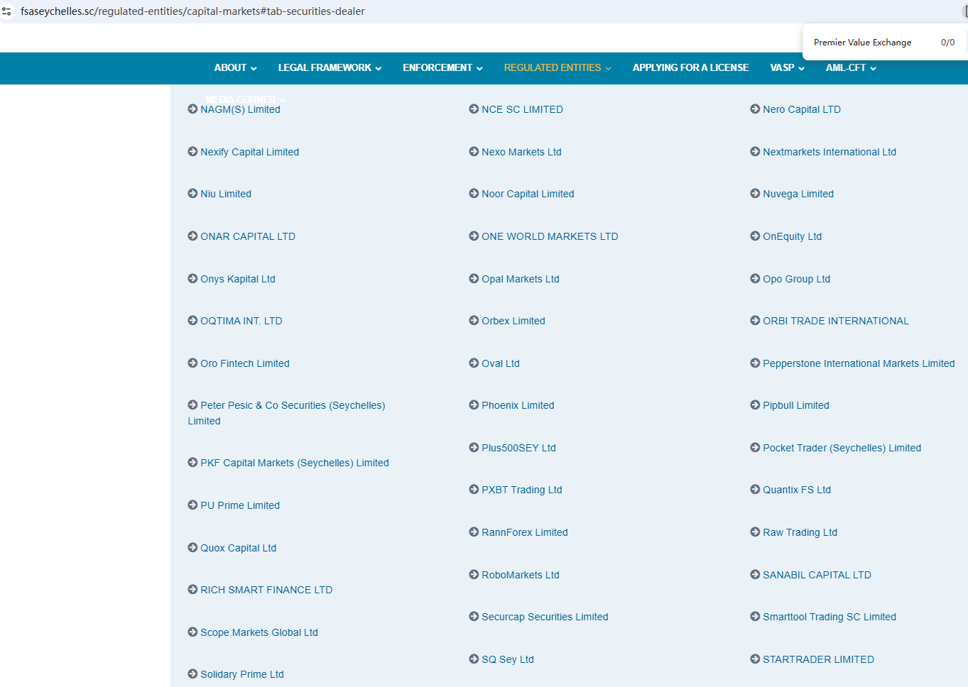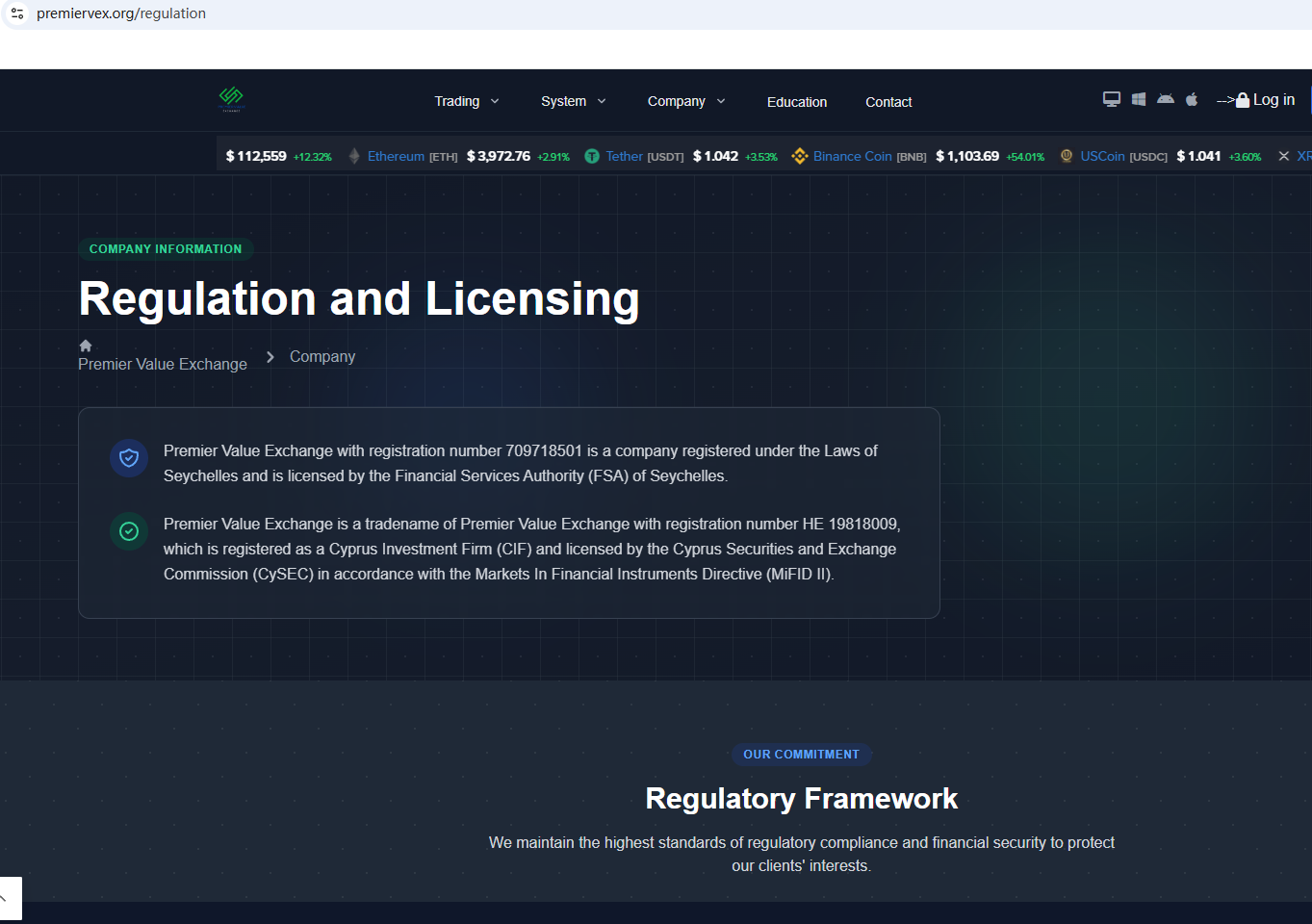 According to its website, it claims to be regulated by the Seychelles Financial Services Authority (Seychelles FSA) and the Cyprus Securities and Exchange Commission (CySEC). Upon investigation, no matching information was found in the Seychelles FSA and CySEC. In addition, the Financial Conduct Authority (FCA) issued a warning regarding Premier Value Exchange, suspecting that this company may be offering financial services or products without the necessary authorization.