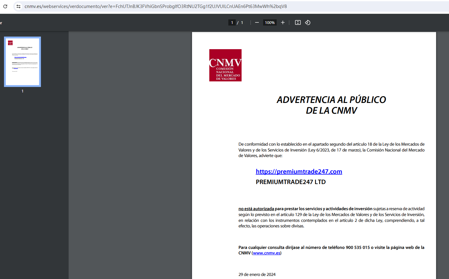 On 29 January 2024, the Comisión Nacional del Mercado de Valores (CNMV) issued a warning that PremiumTrade247 was providing financial services or products without authorisation. You may visit: https://www.cnmv.es/Portal/ResultadoBusqueda.aspx?tipo=1&sortExpression=Fecha&sortDirection=1&page=0