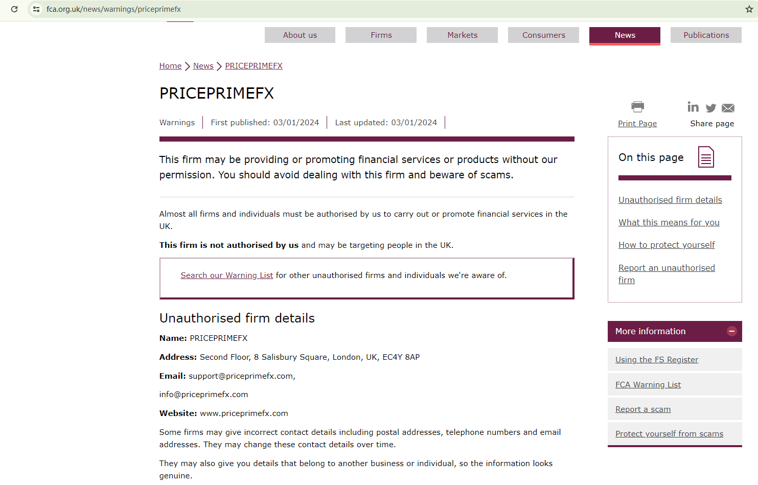 On January 3, 2024, the Financial Conduct Authority (FCA) issued a warning against Price Prime Fx, believing this company might be providing financial services or products without proper authorization in the UK. https://www.fca.org.uk/news/warnings/priceprimefx