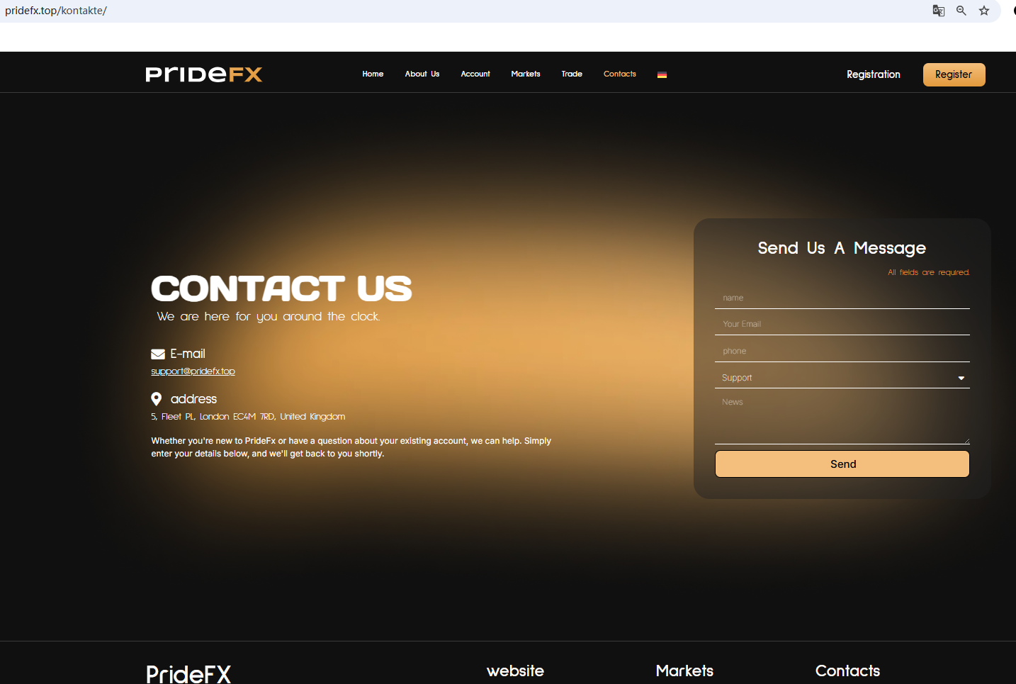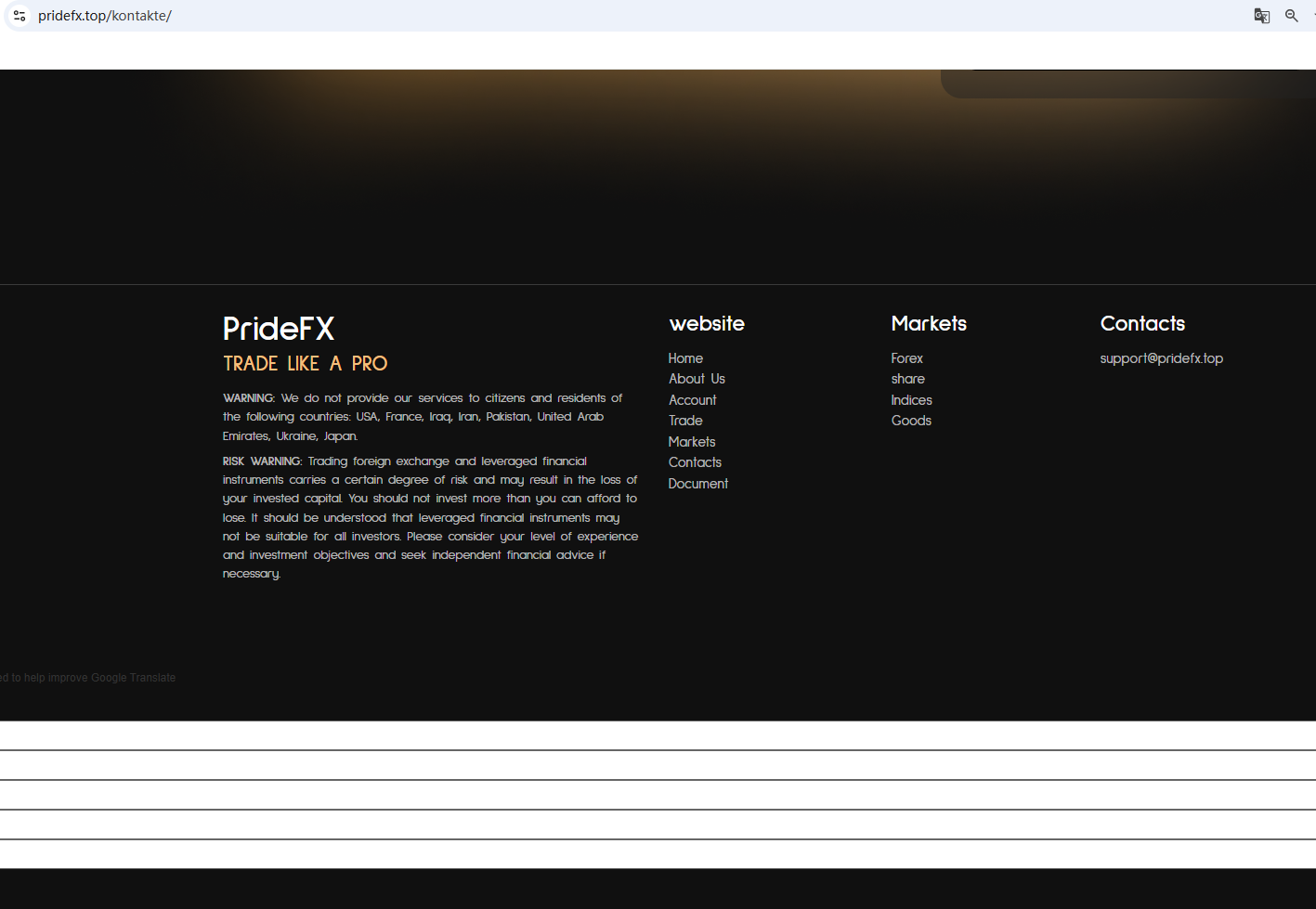 According to its website, it is based in the UK. Upon investigation, no matching information was found in the Financial Conduct Authority (FCA) did not find any matching information. Furthermore, the Federal Financial Supervisory Authority (BaFin) issued a warning against PrideFx for the lack of the required authorization.