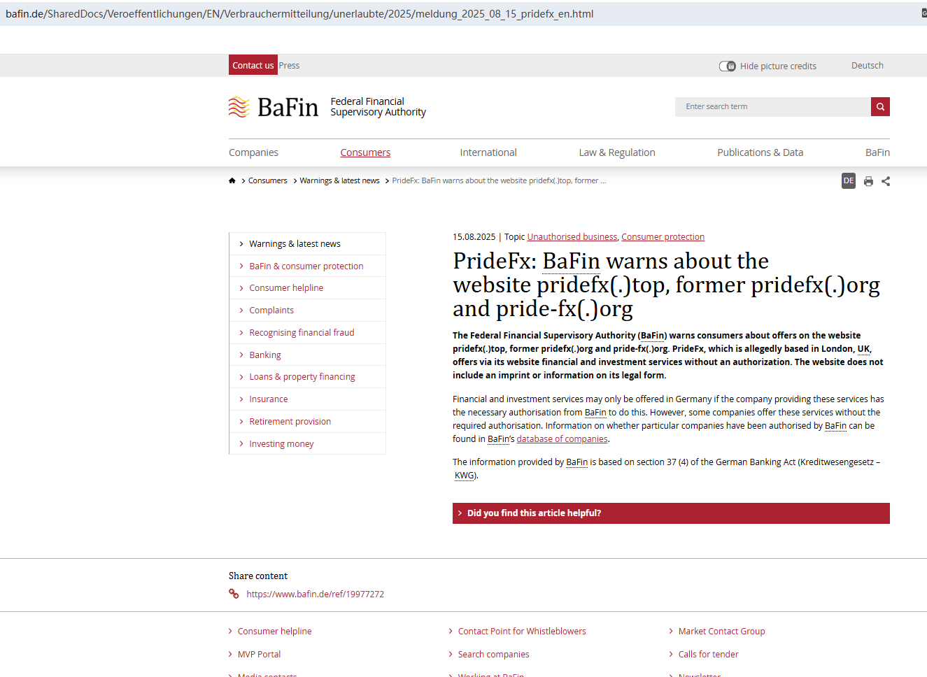 On Aug 15, 2025, the Federal Financial Supervisory Authority (BaFin) issued a warning against PrideFx for the lack of the required authorization. https://www.bafin.de/SharedDocs/Veroeffentlichungen/EN/Verbrauchermitteilung/unerlaubte/2025/meldung_2025_08_15_pridefx_en.html