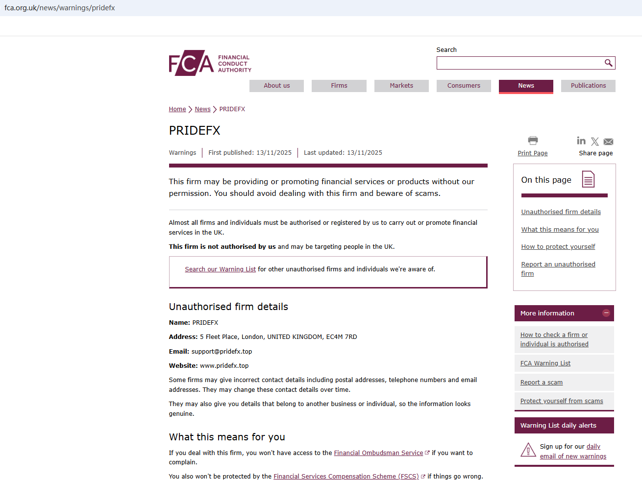 On Nov 13, 2025, the Financial Conduct Authority (FCA) issued a warning regarding PrideFx, suspecting that this company may be offering financial services or products without the necessary authorization. https://www.fca.org.uk/news/warnings/pridefx