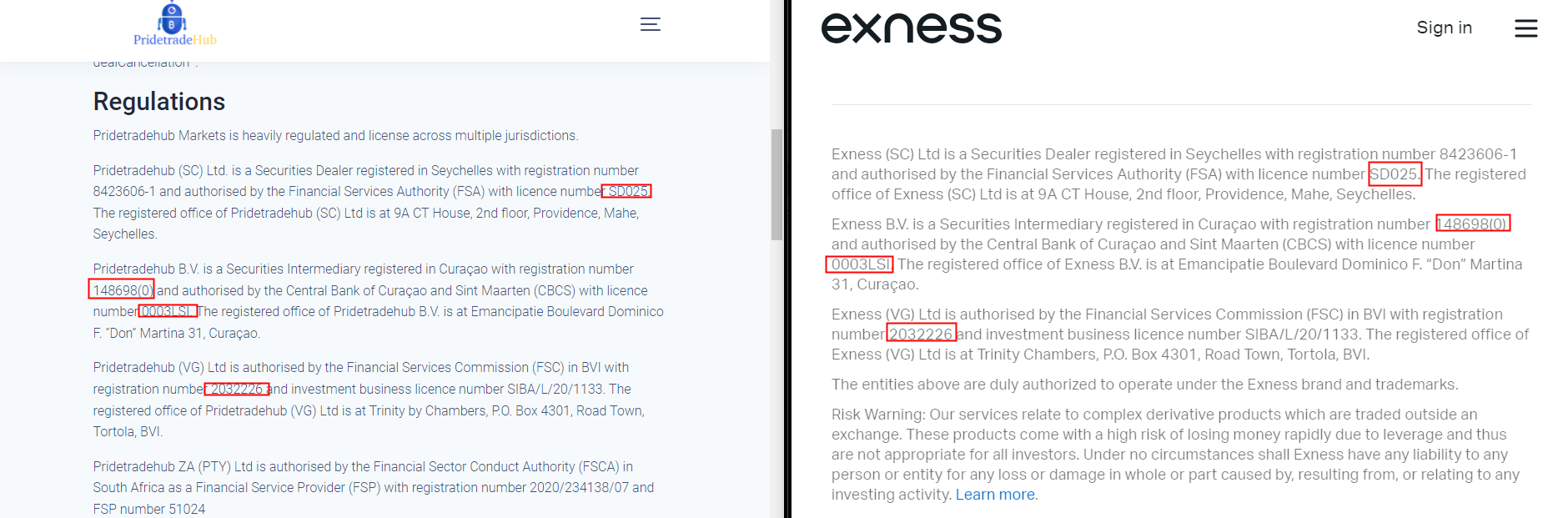 Moreover, the broker professes to be regulated across various jurisdictions, providing details such as registered addresses and license numbers to validate its regulatory claims. Upon investigation, we discovered that this regulatory information is a mere duplication from a legitimate broker, Exness. The attached screenshot offers a clear comparison. It is evident that PRIDETRADEHUB has no affiliation with Exness, and its actions are markedly fraudulent.