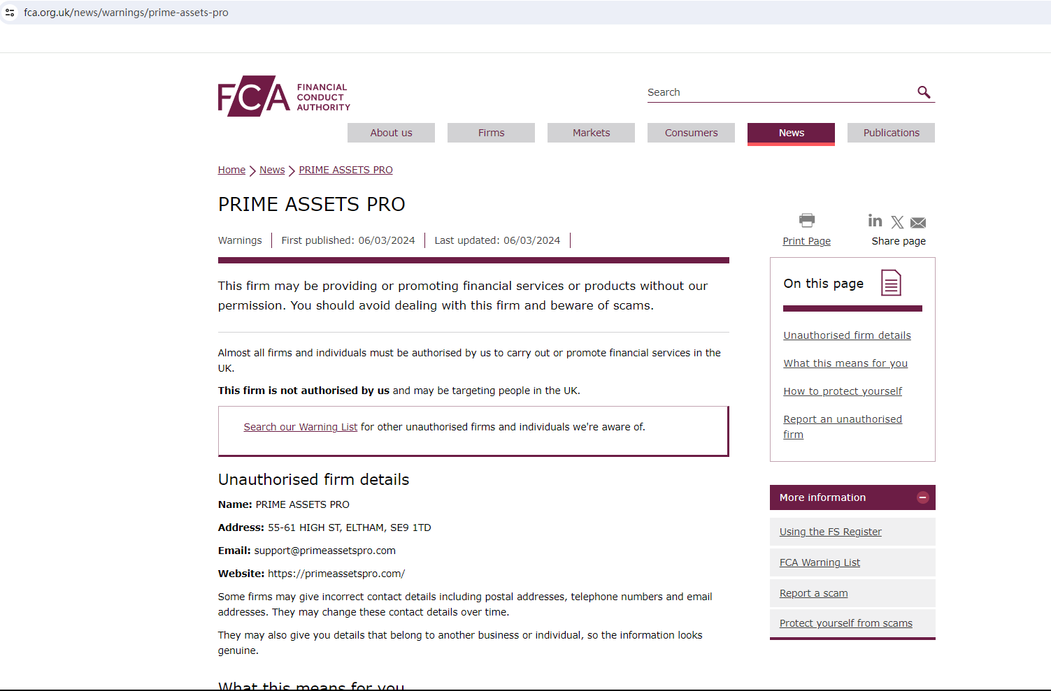 On 6 March 2024, the United Kingdom Financial Conduct Authority (FCA) issued a warning against PRIME ASSETS PRO, believing this company might be providing financial services or products without authorisation in the UK. You may visit: https://www.fca.org.uk/news/warnings/prime-assets-pro