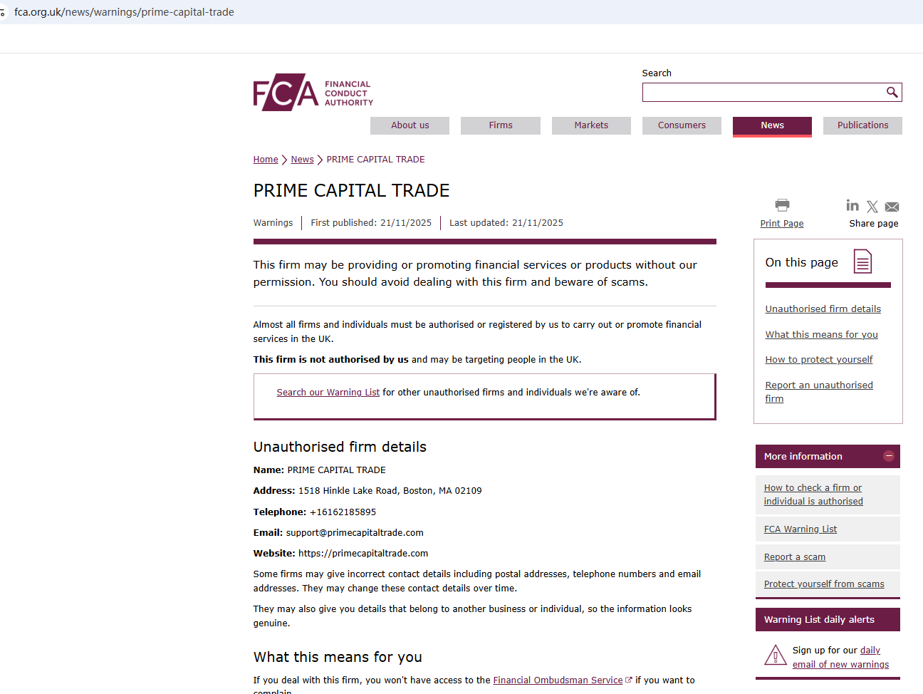 On November 21, 2025, the Financial Conduct Authority (FCA) issued a warning regarding PRIME CAPITAL TRADE, suspecting that this company may be offering financial services or products without the necessary authorization. https://www.fca.org.uk/news/warnings/prime-capital-trade
