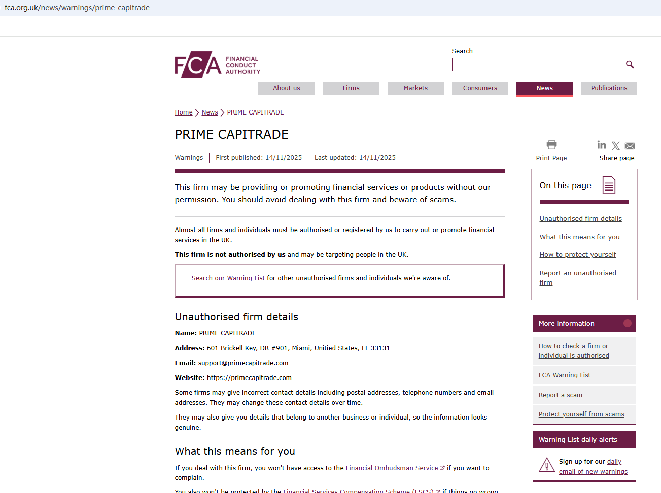 On Nov 14, 2025, the Financial Conduct Authority (FCA) issued a warning regarding PRIME CAPITRADE, suspecting that this company may be offering financial services or products without the necessary authorization. https://www.fca.org.uk/news/warnings/prime-capitrade