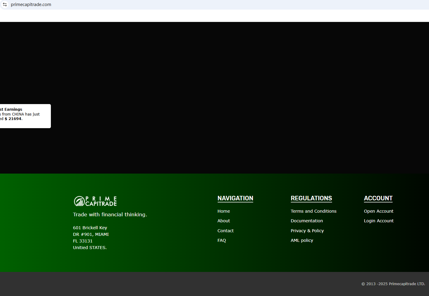 According to its website, it claims to be regulated in the UK, with its office located in the US. Upon investigation, no matching information was found in the National Futures Association (NFA). In addition, the Financial Conduct Authority (FCA) issued a warning regarding PRIME CAPITRADE, suspecting that this company may be offering financial services or products without the necessary authorization.