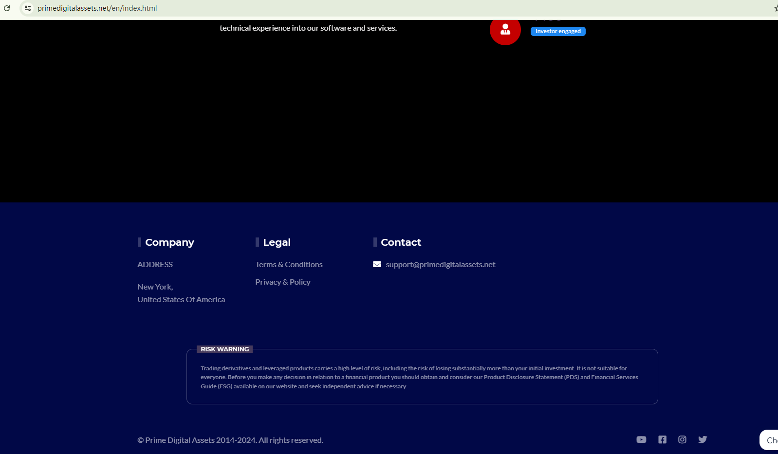 PRIME DIGITAL ASSETS vaguely claims to be domiciled in New York, yet doesn't provide the specific physical address. The lack of transparency is deemed a red flag.