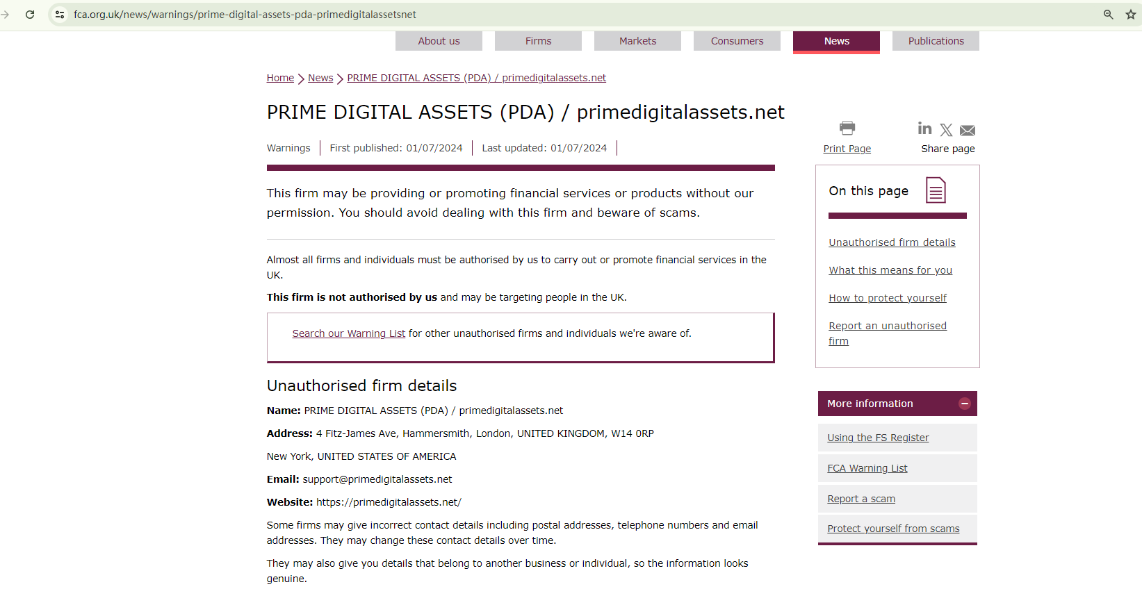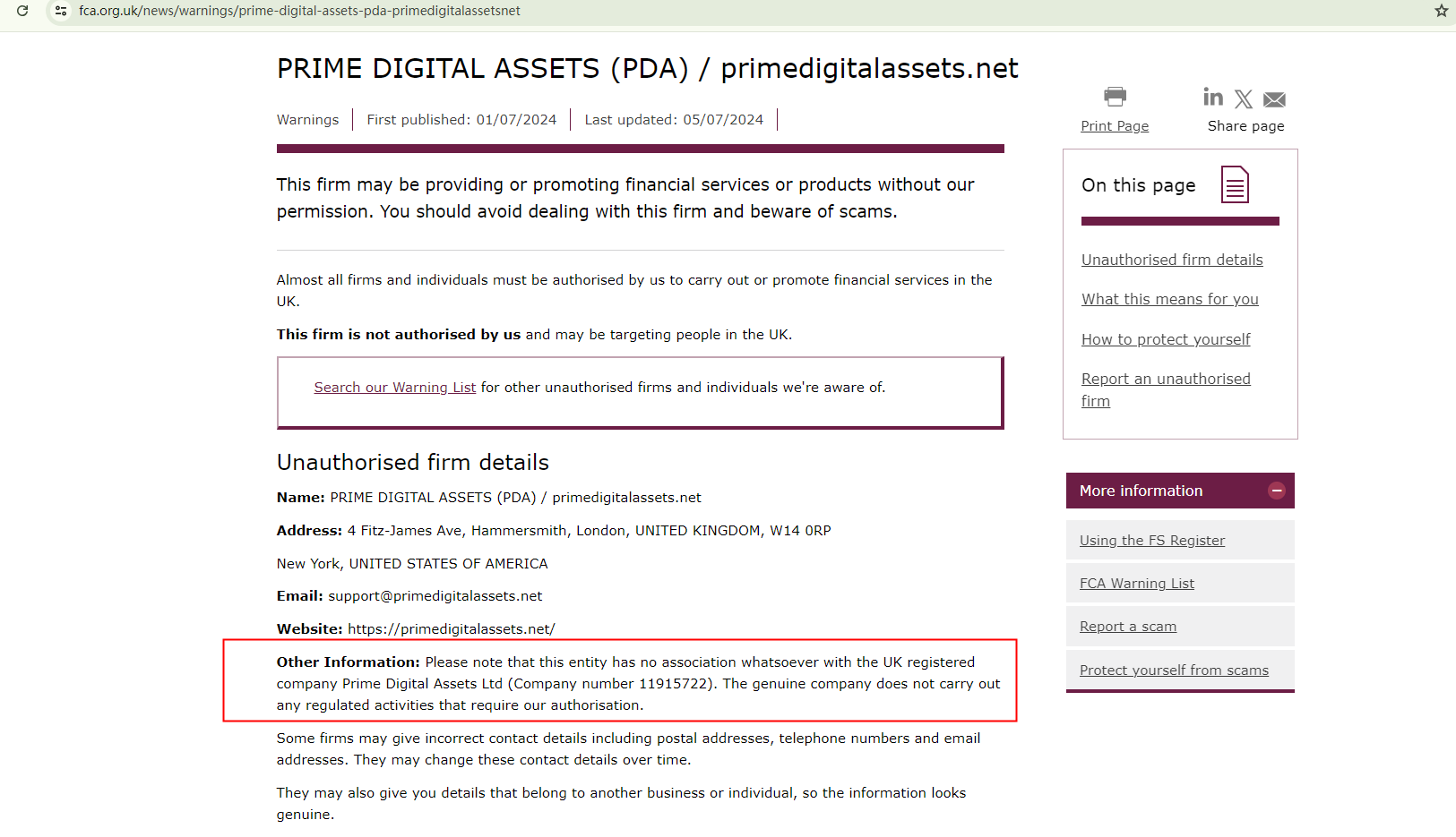 The Financial Conduct Authority (FCA) updated its warning against PRIME DIGITAL ASSETS on July 5, 2024, to clarify that the unauthorized firm has no association with the UK registered company Prime Digital Assets Ltd (Company number 11915722). https://www.fca.org.uk/news/warnings/prime-digital-assets-pda-primedigitalassetsnet