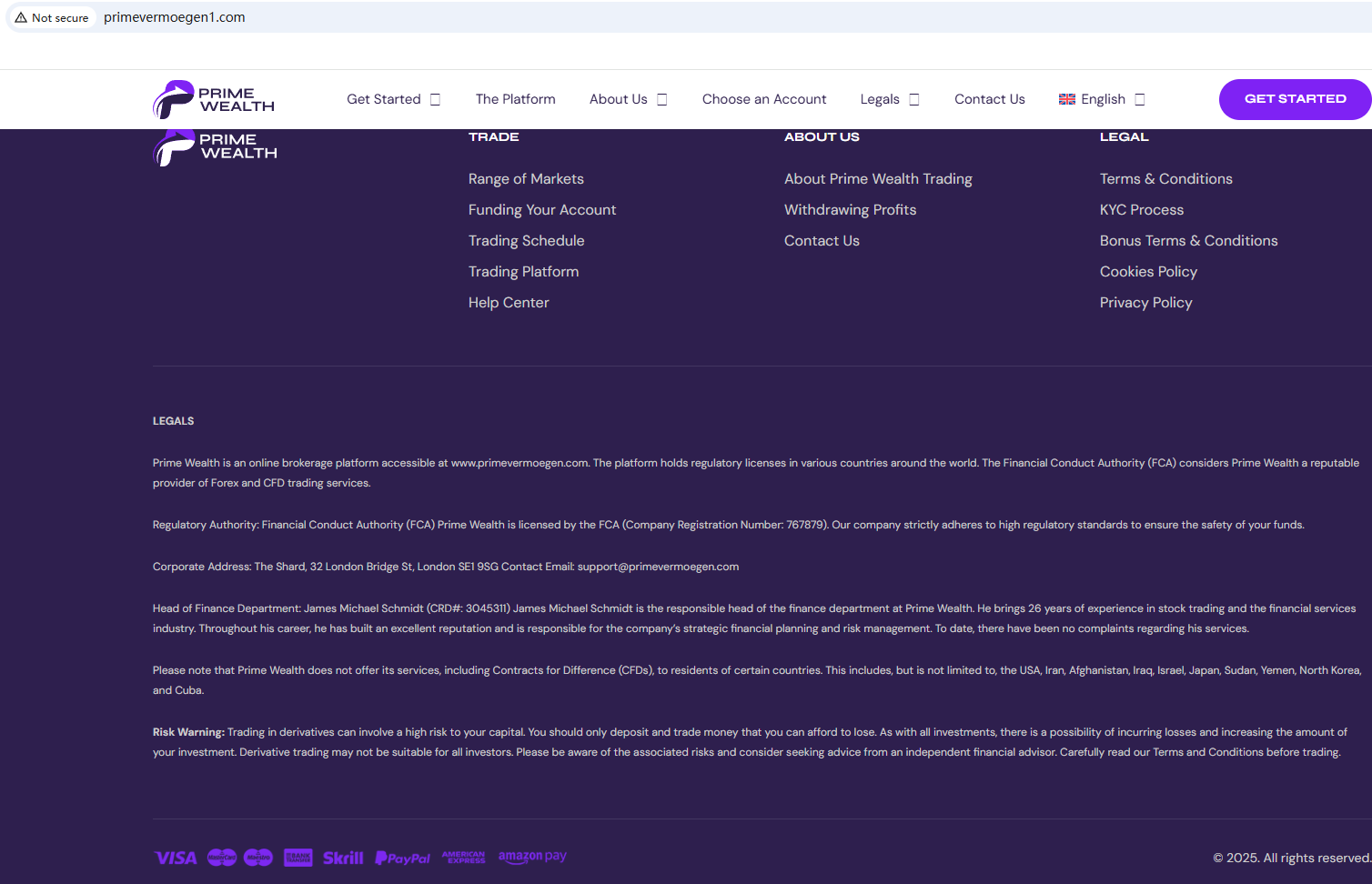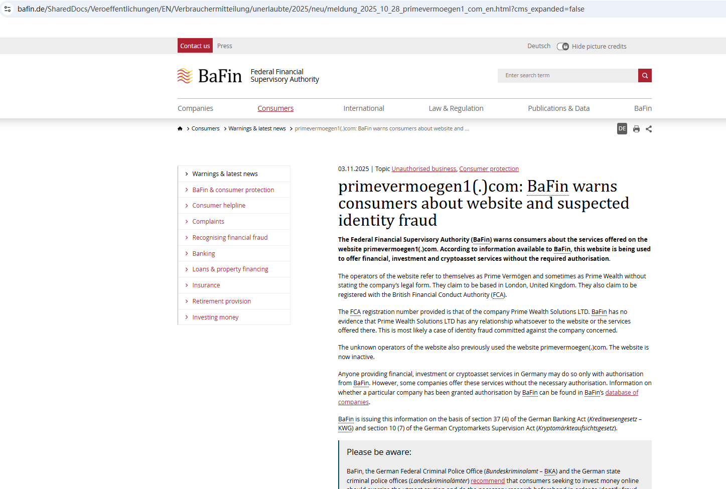 According to its website, it claims to be regulated by the Financial Conduct Authority (FCA) and provides a regulatory number at the bottom of the site. However, our investigation revealed that Prime Wealth's website does not match the URL listed in the FCA's records. Prime Wealth has stolen the regulatory information of a compliant company in an attempt to impersonate it. Furthermore, the Federal Financial Supervisory Authority (BaFin) issued a warning against Prime Wealth for the lack of the required authorization.