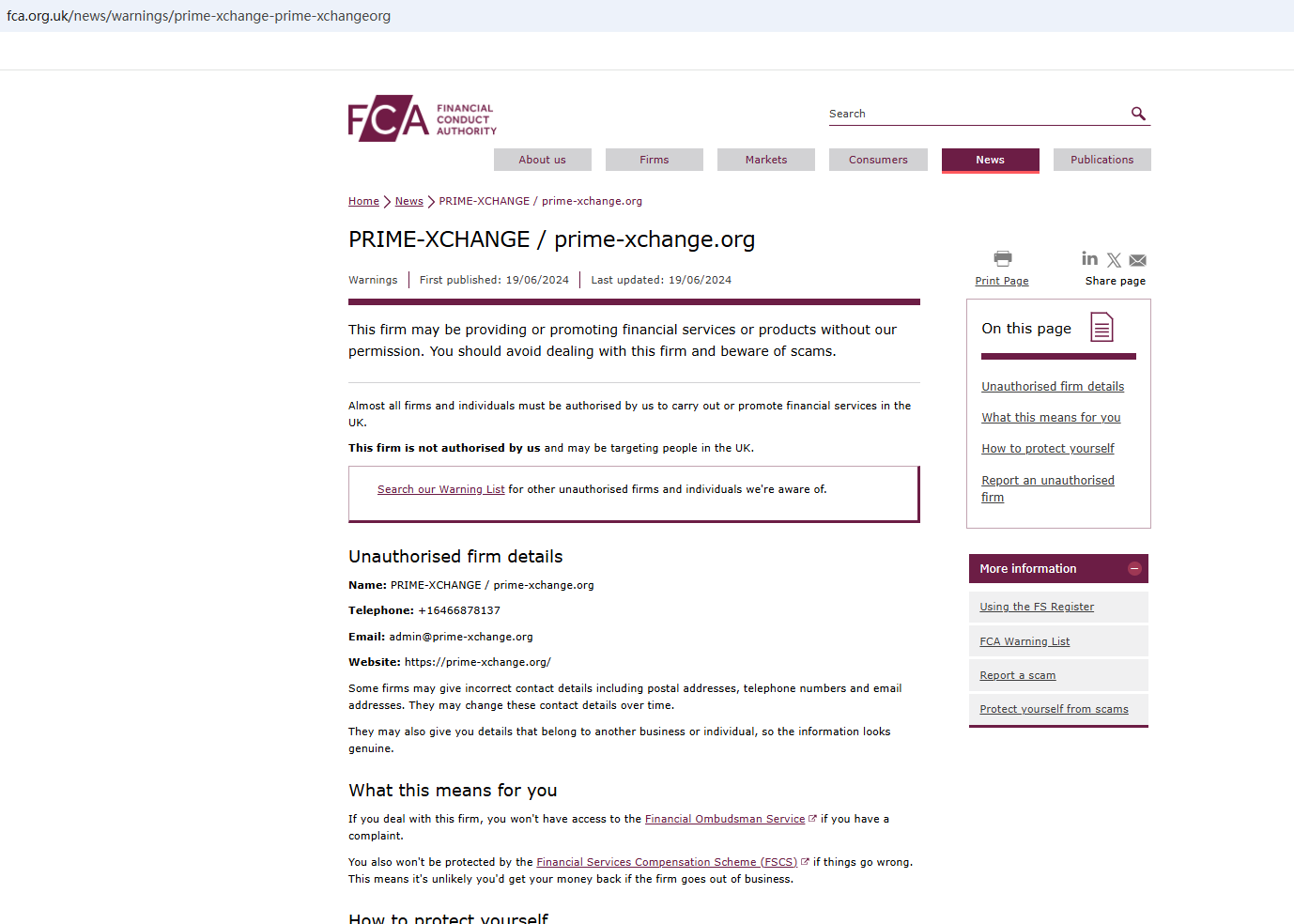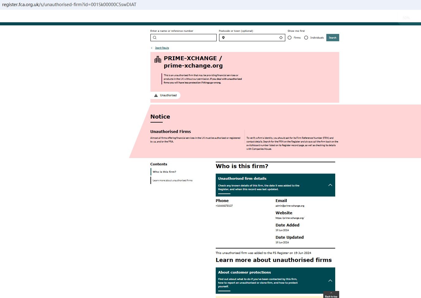 According to its website, it is located in the UK. Upon investigation, we found out that it is not authorized by the Financial Conduct Authority (FCA). In addition, the National Securities Market Commission (CNMV) issued a warning against PRIME XCHANGE, believing this company might be providing financial services or products without proper authorization.