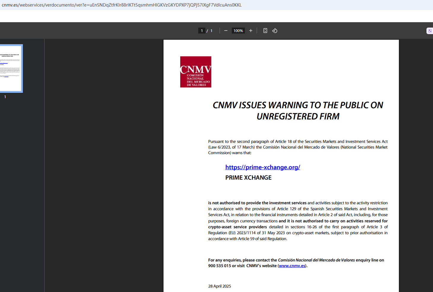 On April 28, 2025, the National Securities Market Commission (CNMV) issued a warning against PRIME XCHANGE, believing this company might be providing financial services or products without proper authorization. https://www.cnmv.es/webservices/verdocumento/ver?e=uEnSNDqZtfrKIr88rIKTt5qsmhmHlGKVzGKYDPXP7jQPj57IXgF7VdIcuAns0KKL