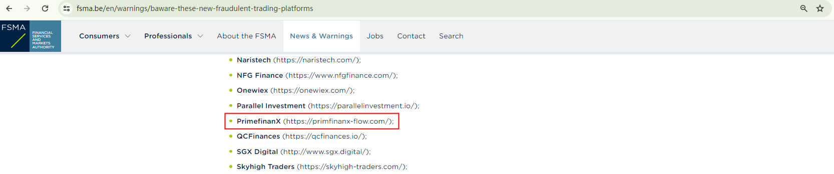In addition, the Belgian Financial Services and Markets Authority (FSMA) has added PrimefinanX to its warning list as a fraudulent trading platform.