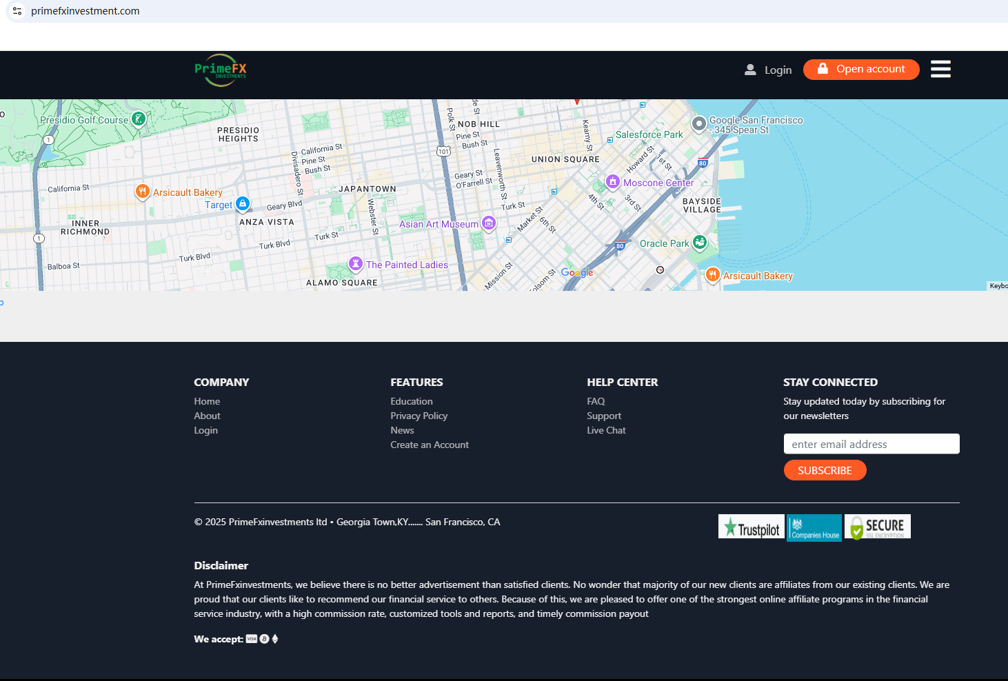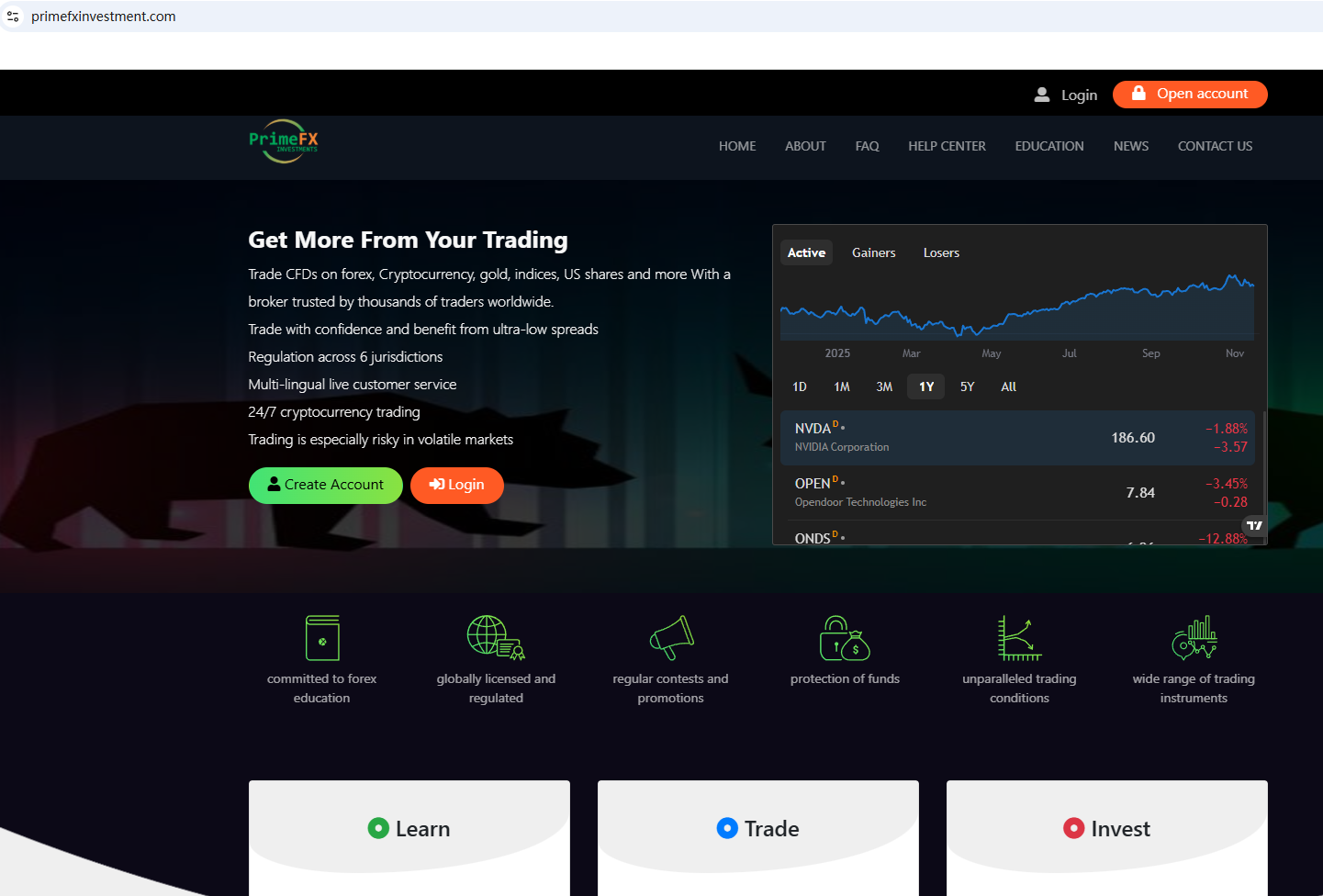 According to its website, it is located in the US. Upon investigation, no matching information was found in the National Futures Association (NFA). In addition, the Financial Conduct Authority (FCA) issued a warning regarding PRIMEFX INVESTMENTS, suspecting that this company may be offering financial services or products without the necessary authorization.
