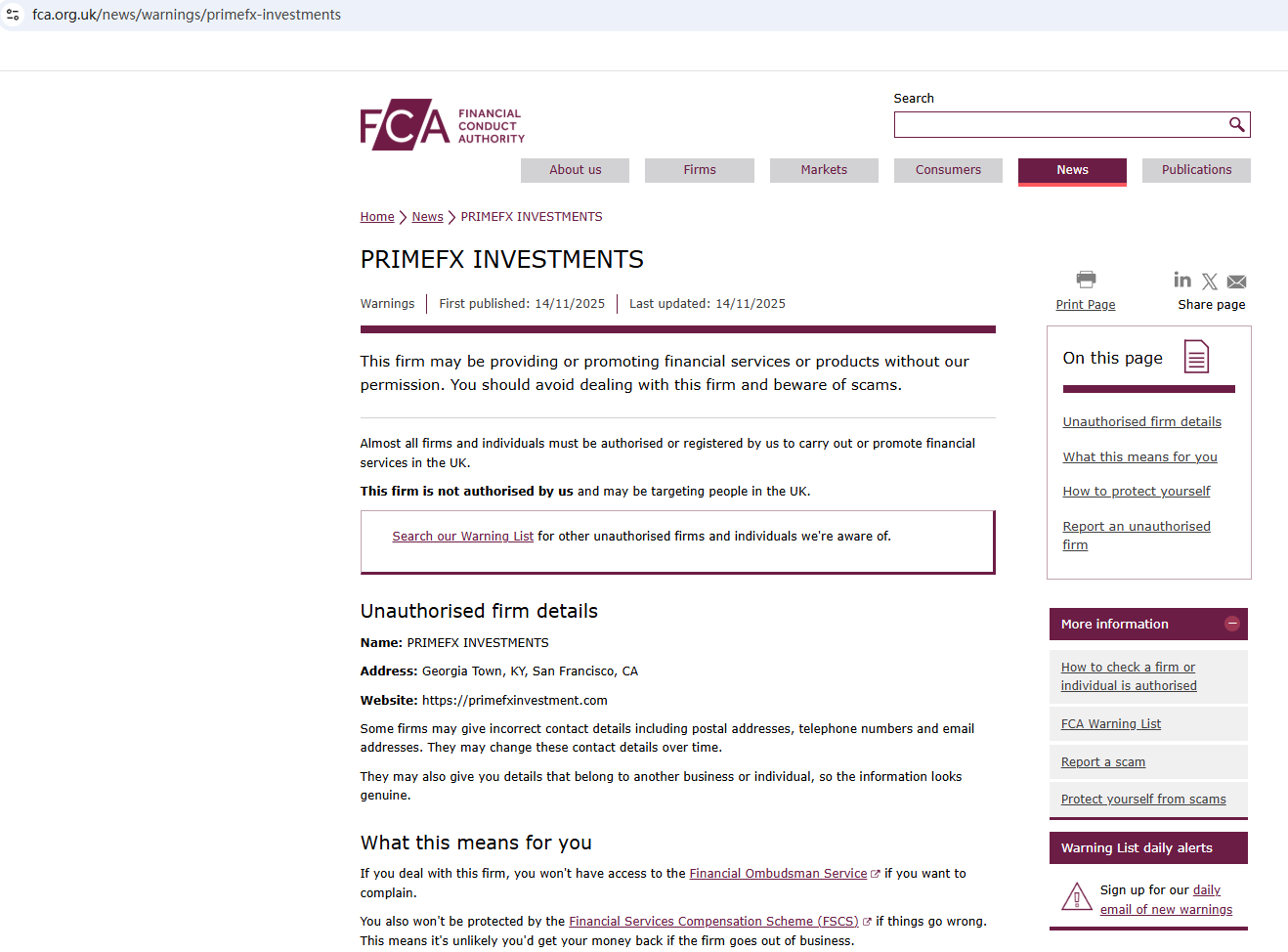 On Nov 14, 2025, the Financial Conduct Authority (FCA) issued a warning regarding PRIMEFX INVESTMENTS, suspecting that this company may be offering financial services or products without the necessary authorization. https://www.fca.org.uk/news/warnings/primefx-investments
