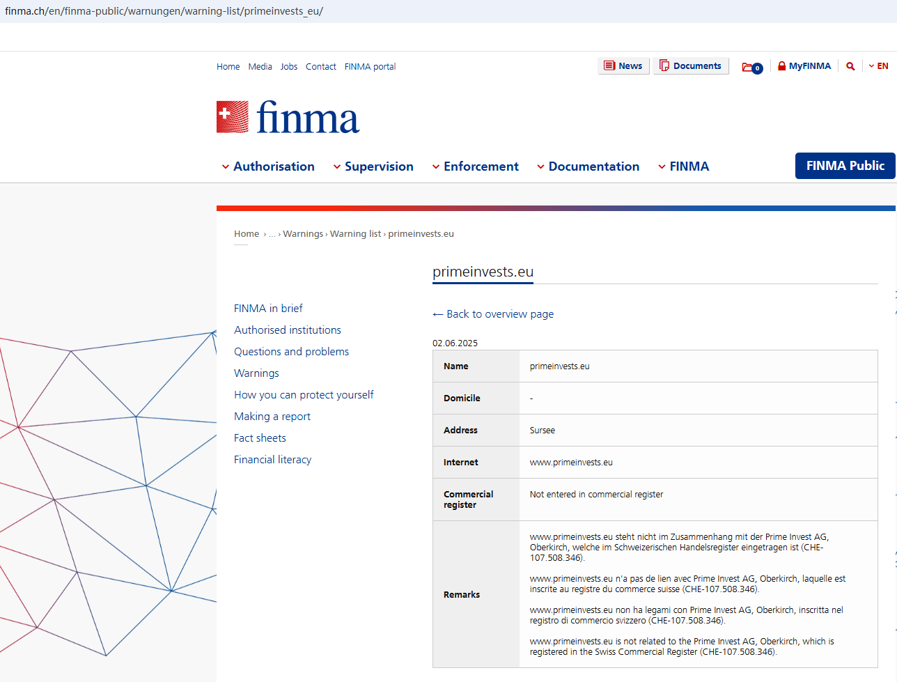 On June 2, 2025, the Swiss Financial Market Supervisory Authority (FINMA) issued a warning against PrimeInvests, stating that this broker is not entered in its commercial register. https://www.finma.ch/en/finma-public/warnungen/warning-list/primeinvests_eu/