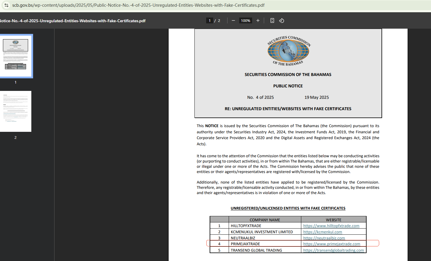 On May 19, 2025, the Securities Commission of The Bahamas (SCB) added PRIMEJAXTRADE to warning list for offering financial services or products without their permission. https://www.scb.gov.bs/wp-content/uploads/2025/05/Public-Notice-No.-4-of-2025-Unregulated-Entities-Websites-with-Fake-Certificates.pdf