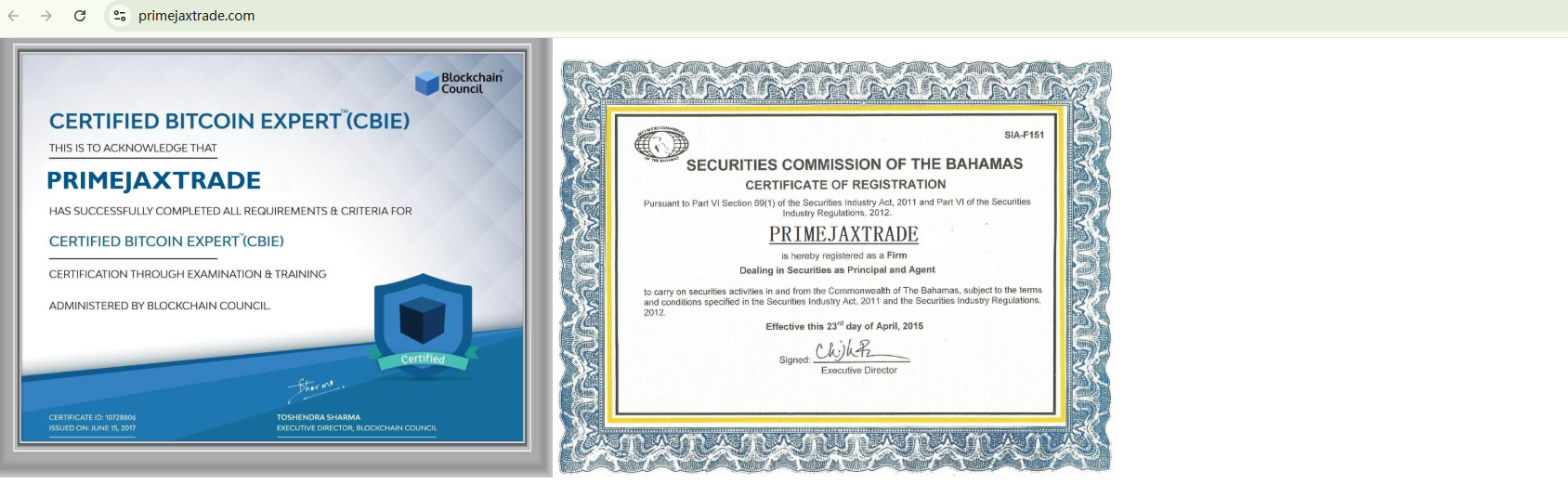 PRIMEJAXTRADE fabricates legitimacy by displaying two falsified certificates, including a fake license allegedly from the Securities Commission of The Bahamas (SCB)—a claim that has been explicitly refuted by the SCB in an official warning.