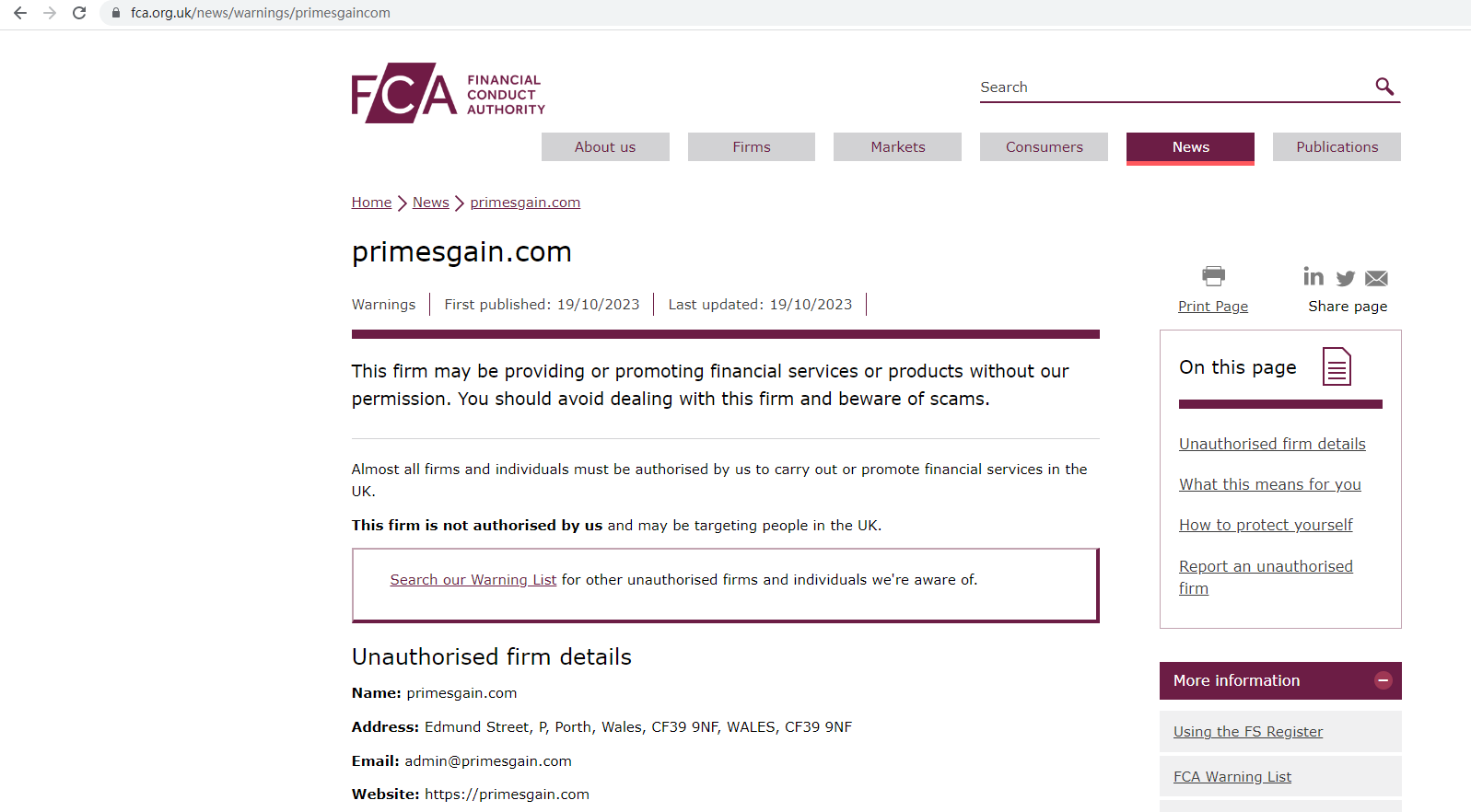On 19 October 2023, the United Kingdom Financial Conduct Authority (UK FCA) issued a warning that primesgain.com was providing financial services or products in the UK without authorisation. You may visit: https://www.fca.org.uk/news/warnings/primesgaincom