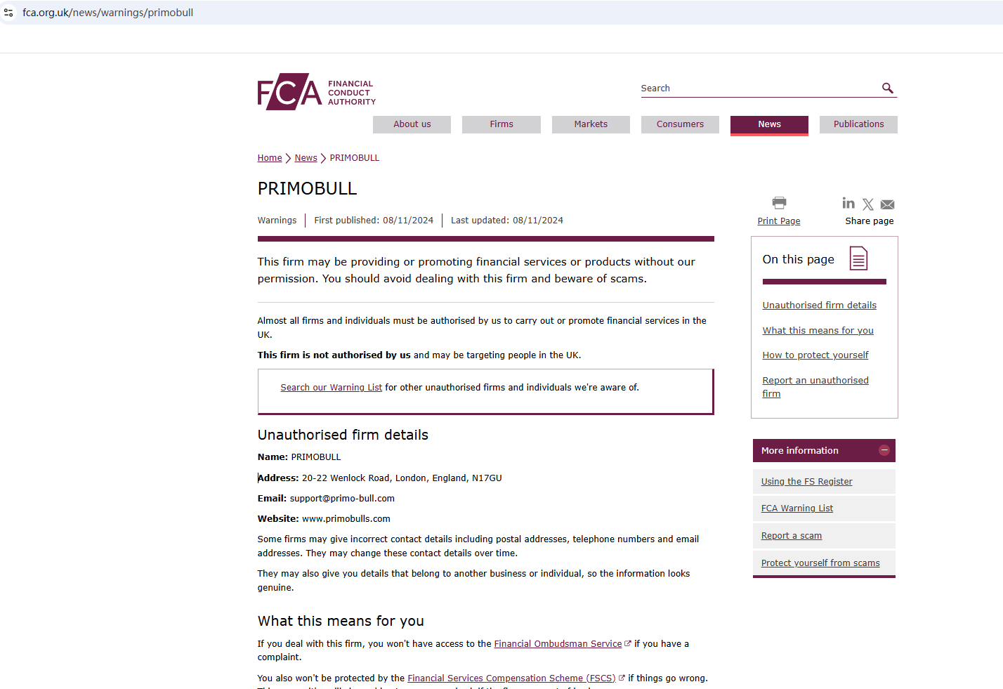 On November 8, 2024, the Financial Conduct Authority (FCA) issued a warning against PRIMOBULL, believing this company might be providing financial services or products without proper authorization in the UK. https://www.fca.org.uk/news/warnings/primobull