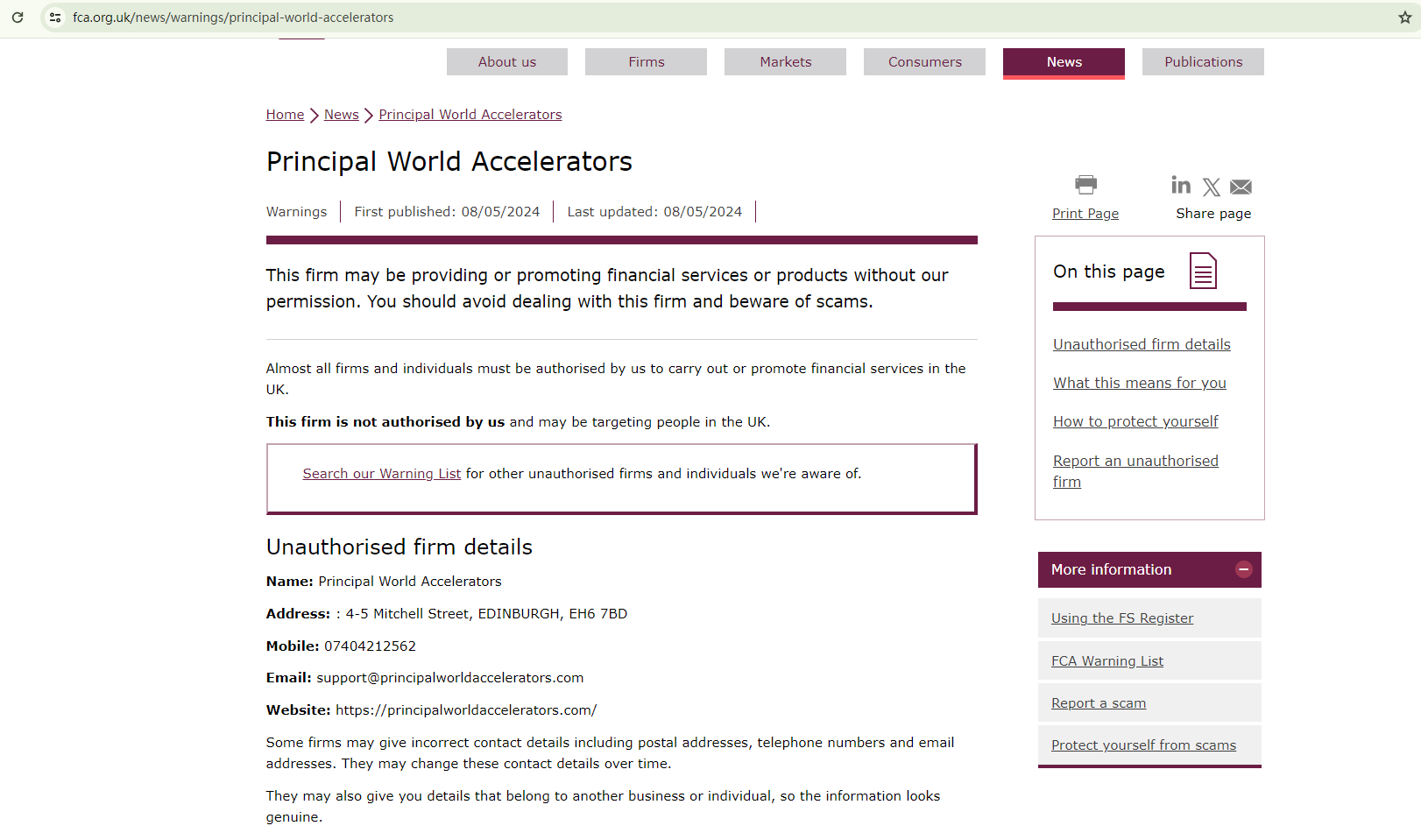On May 8, 2024, the Financial Conduct Authority (FCA) issued a warning against Principal World Accelerators, believing this company might be providing financial services or products without proper authorization in the UK. https://www.fca.org.uk/news/warnings/principal-world-accelerators